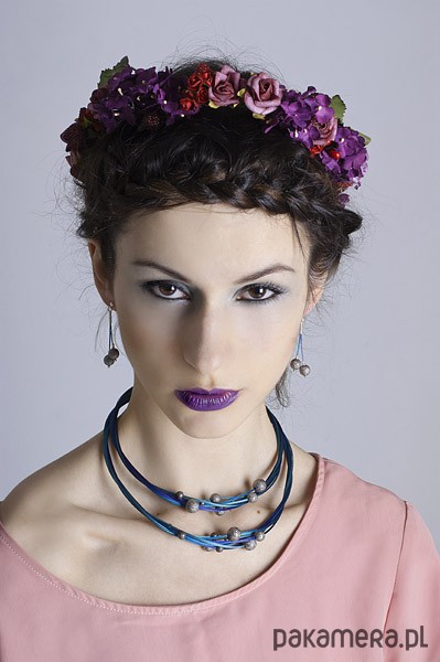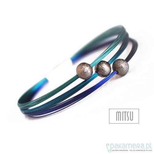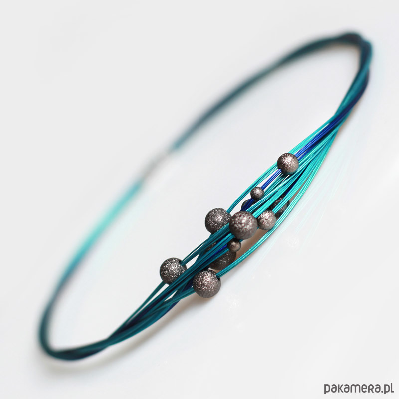 Naszyjnik zbudowany ze stalowych linek krytych nylonem w kolorach kobaltowy, turkusowy, lazurowy.