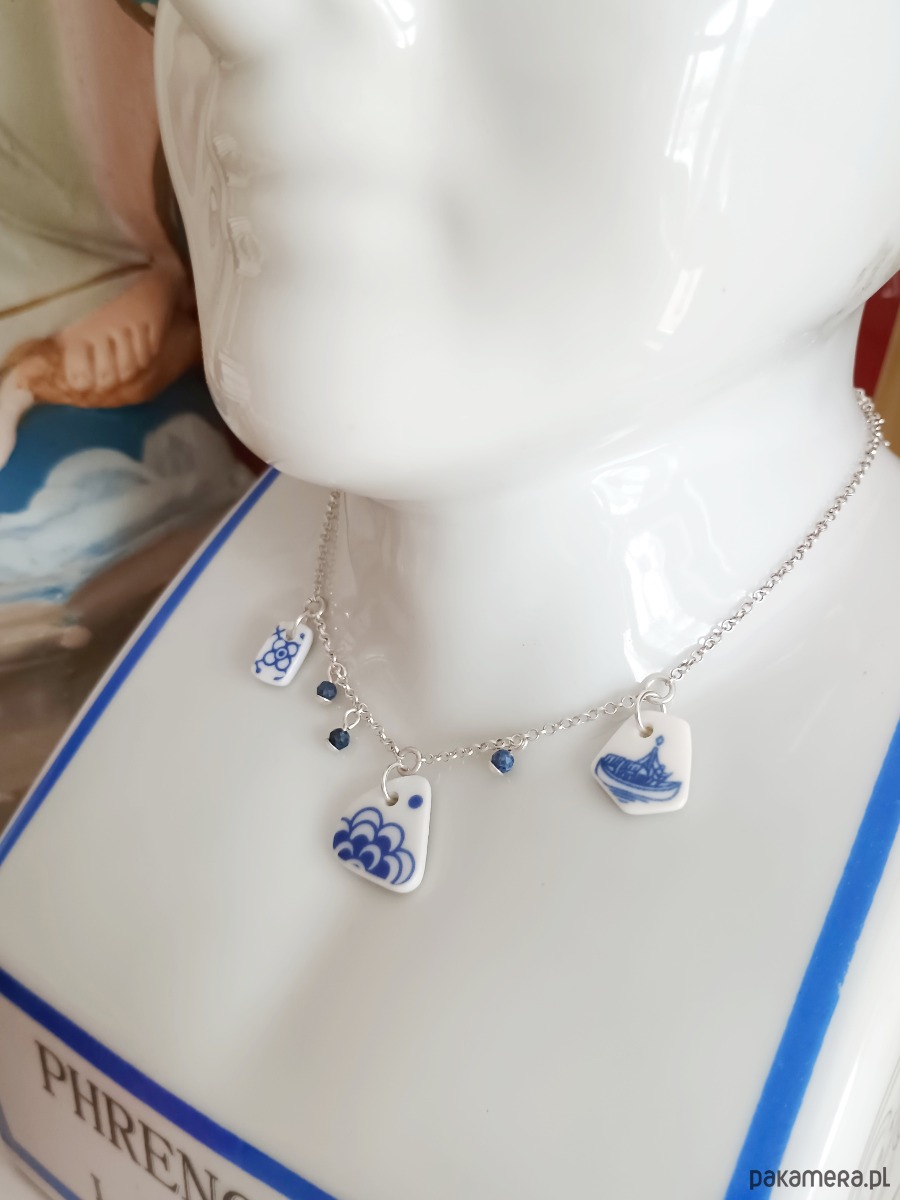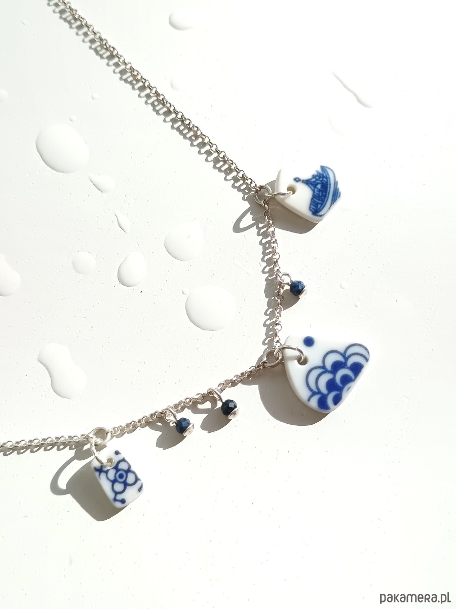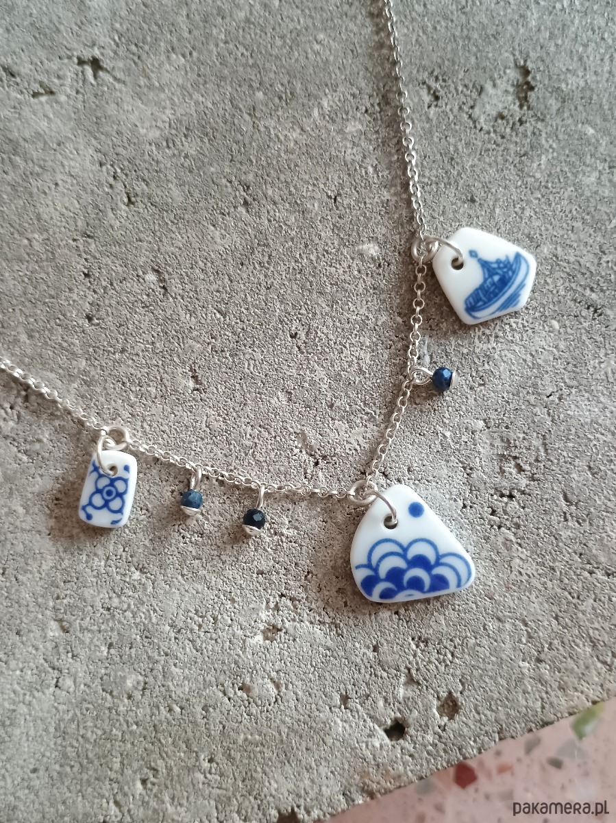 Oto kolia - naszyjnik wieloelementowy, który wykonałam z fragmentów stłuczonych porcelanowych naczyń w kobaltowe wzory. Fragmenty, czyli zawieszki oszlifowałam w nieregularne kształty i połączyłam z łańcuszkiem (srebro próby 925). Ceramikę zeszlifowałam również z grubości - jest cieńsza niż pierwotnie, dzięki czemu zawieszki nie są masywne. Brzegi i tył pokryłam lakierem, co sprawia, że nie brudzą się i nie chłoną wilgoci. Elementy ceramiczne skomponowałam z szafirami. Wymiary elementów ceramicznych: od 7 x 11 do 15 x 16 mm. Ilość zawieszek ceramicznych: 3 sztuki. Długość łańcuszka w całości: 45 cm. Unikat - każdy z moich wyrobów występuje w jednym egzemplarzu. Upcykling - nie reprodukuję wykorzystywanych wzorów, niczego nie domalowuję - wykorzystuję wyłącznie oryginalne naczynia i motywy, które się na nich znajdują.