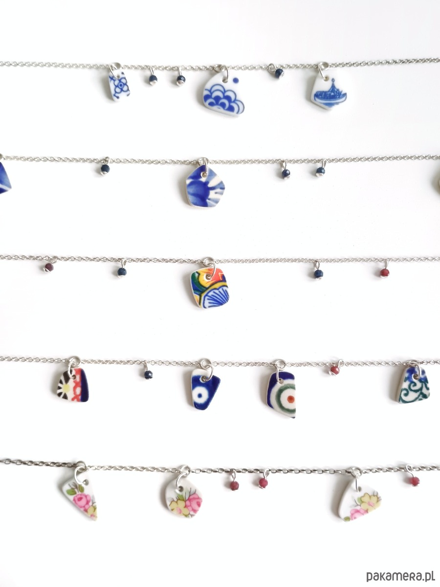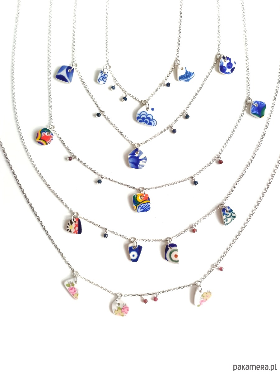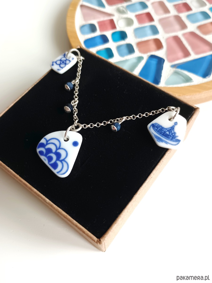 Oto kolia - naszyjnik wieloelementowy, który wykonałam z fragmentów stłuczonych porcelanowych naczyń w kobaltowe wzory. Fragmenty, czyli zawieszki oszlifowałam w nieregularne kształty i połączyłam z łańcuszkiem (srebro próby 925). Ceramikę zeszlifowałam również z grubości - jest cieńsza niż pierwotnie, dzięki czemu zawieszki nie są masywne. Brzegi i tył pokryłam lakierem, co sprawia, że nie brudzą się i nie chłoną wilgoci. Elementy ceramiczne skomponowałam z szafirami. Wymiary elementów ceramicznych: od 7 x 11 do 15 x 16 mm. Ilość zawieszek ceramicznych: 3 sztuki. Długość łańcuszka w całości: 45 cm. Unikat - każdy z moich wyrobów występuje w jednym egzemplarzu. Upcykling - nie reprodukuję wykorzystywanych wzorów, niczego nie domalowuję - wykorzystuję wyłącznie oryginalne naczynia i motywy, które się na nich znajdują.
