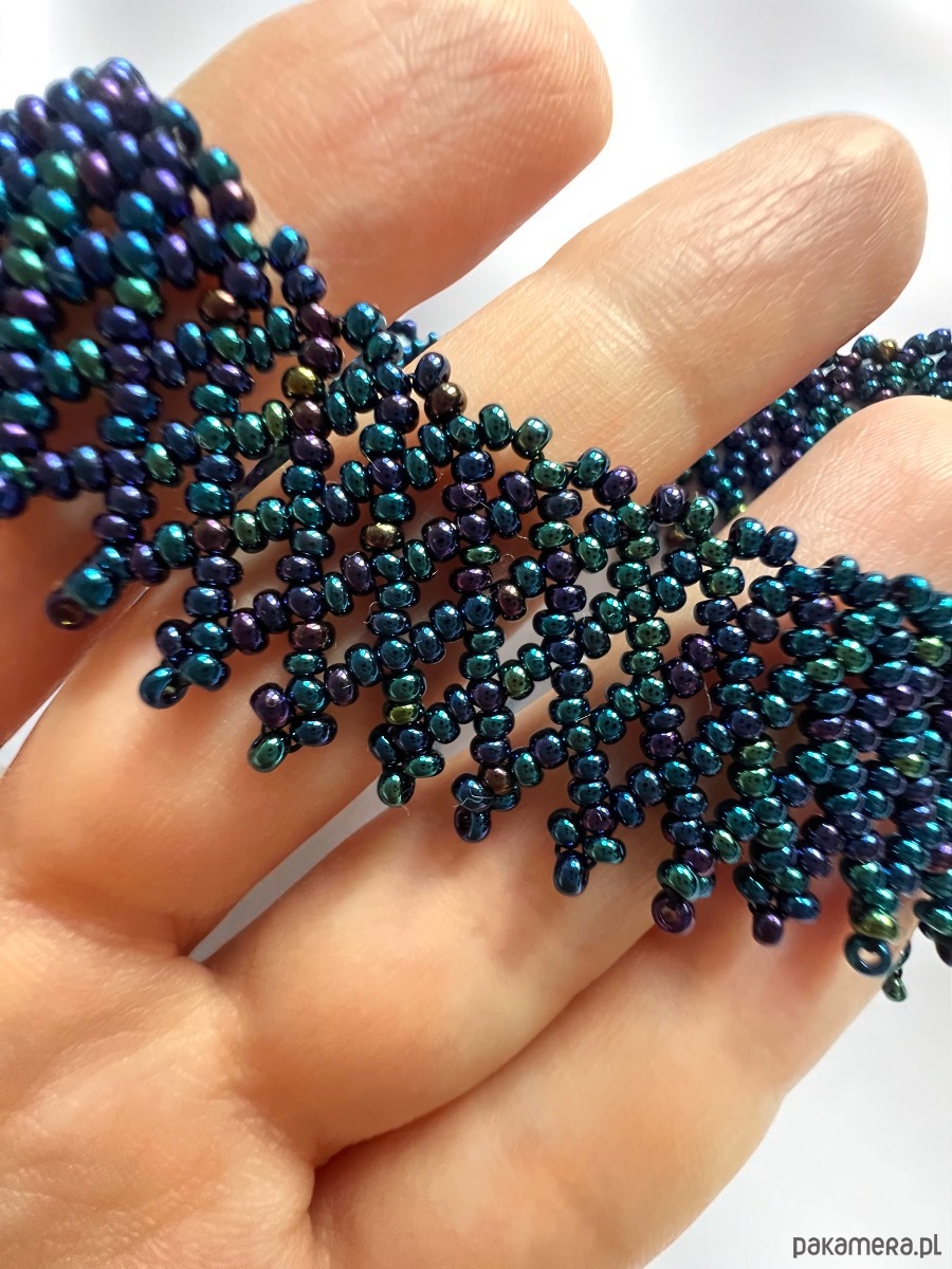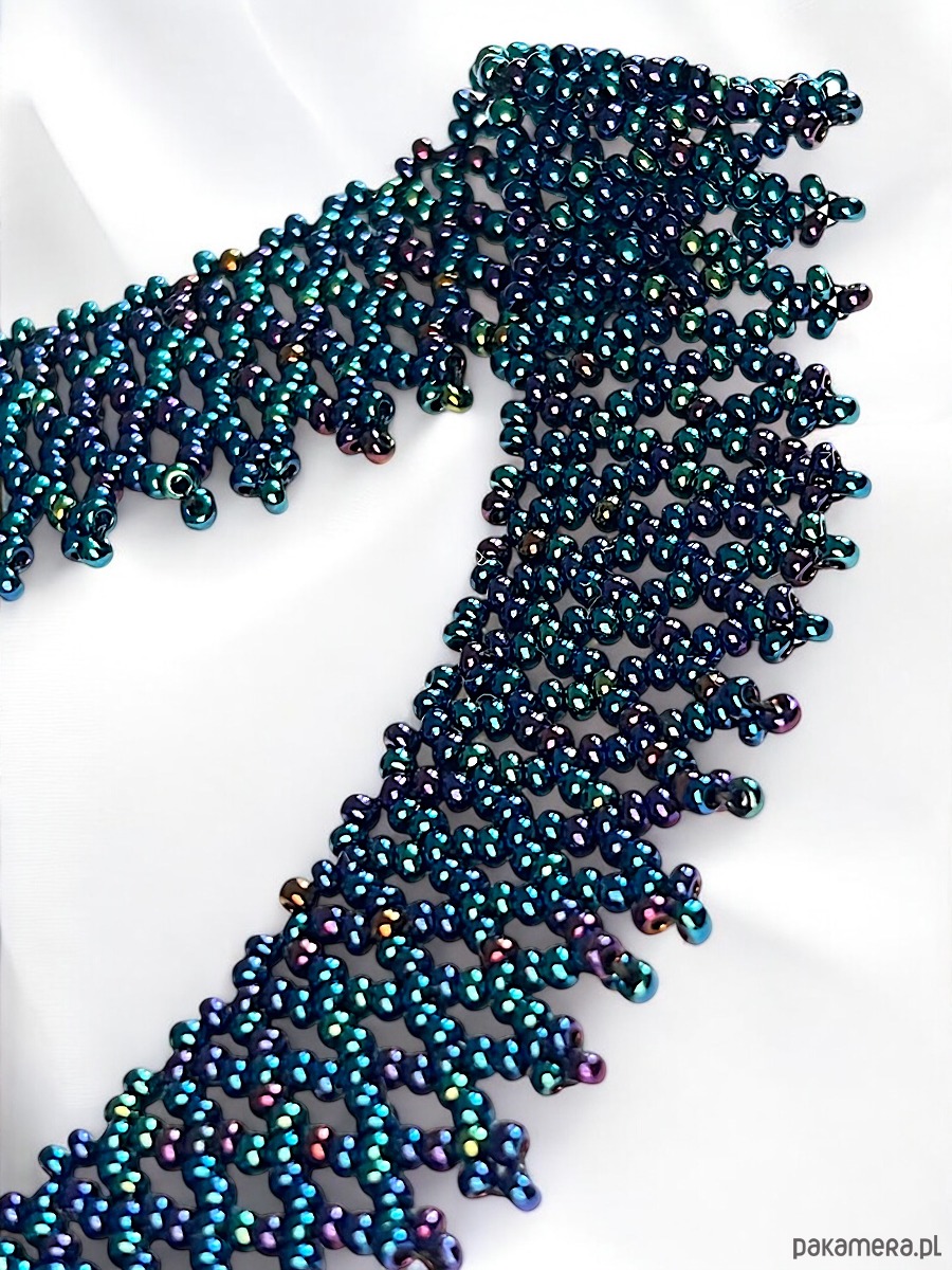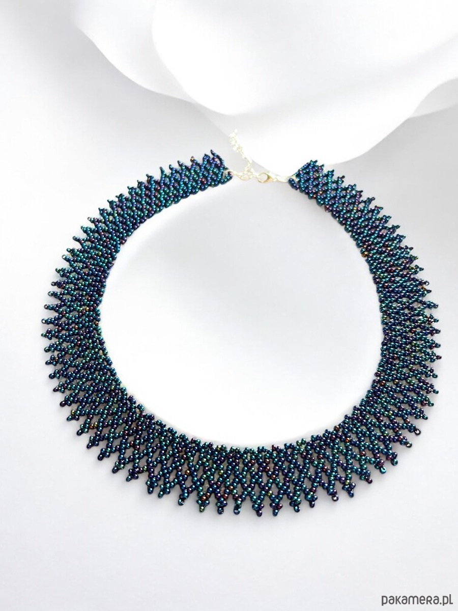 Ten misternie pleciony naszyjnik z drobnych koralików zachwyca unikatowym kolorem – ciemnoniebieskim z benzynowym połyskiem, który pięknie mieni się w świetle. To biżuteria ręcznie wykonana z pasją, która dodaje szyku i wyjątkowości każdej stylizacji.