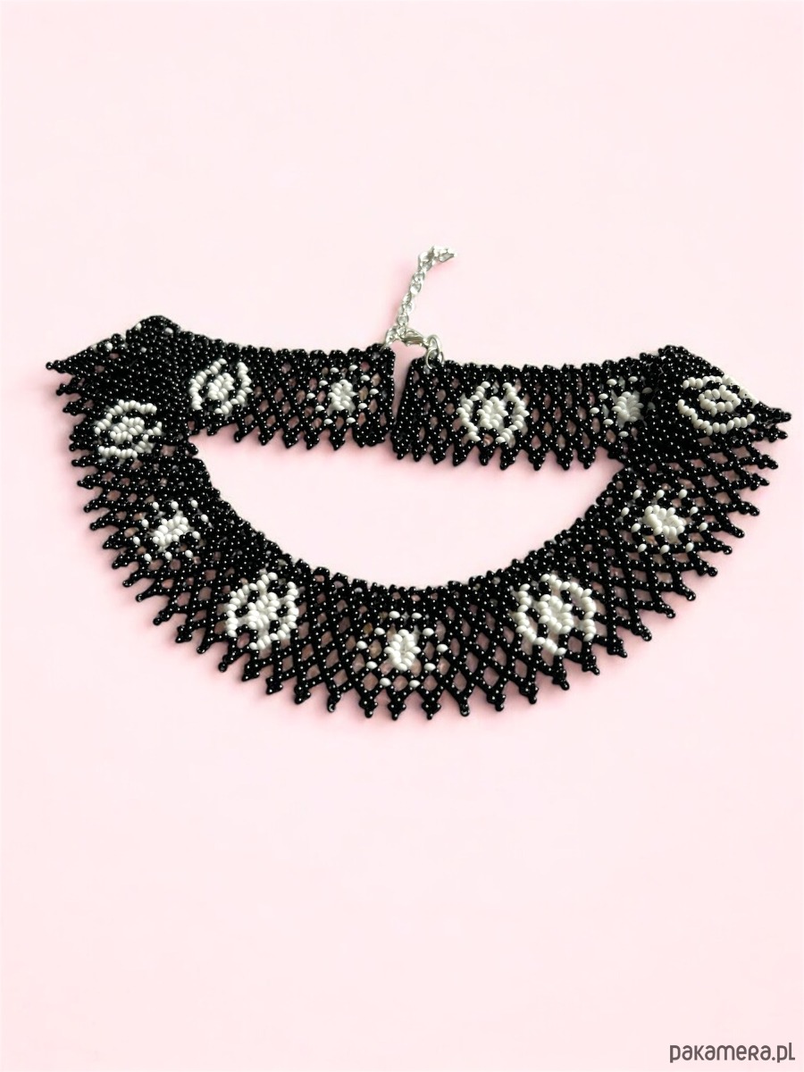 Kolia koralikowa czarno-biała z ornamentem naszyjnik rękodzieło