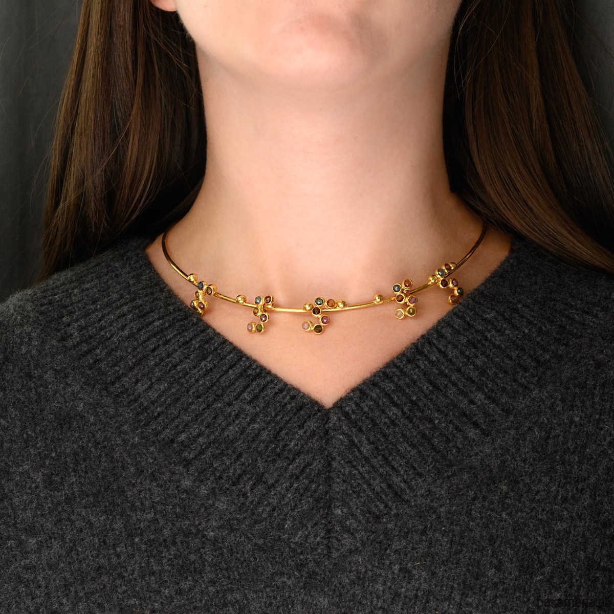 Unikatowa kolia - naszyjnik wykonany ze srebra, pozłacanego 24-karatowym złotem z turmalinami. To wyjątkowa biżuteria, jest to prawdziwe arcydzieło, które zdobędzie serce każdej kobiety i dodaje jej wyjątkowego blasku.
