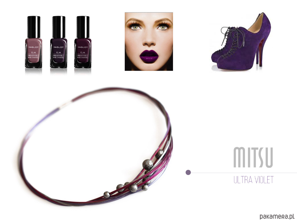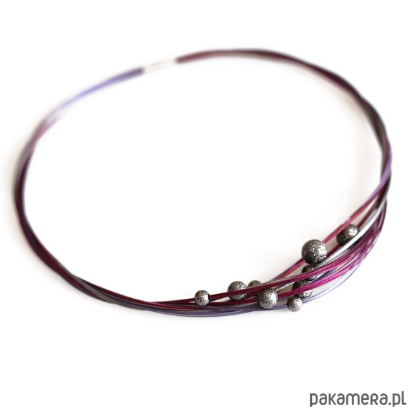 Śliwkowa kolia, wykonana ze stalowych linek pokrytych nylonem w kilku odcieniach fioletu oraz metalowych teksturowanych kul.