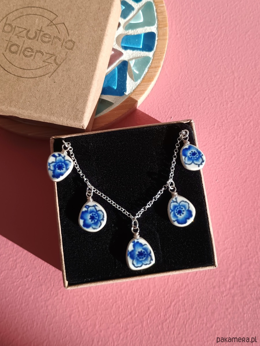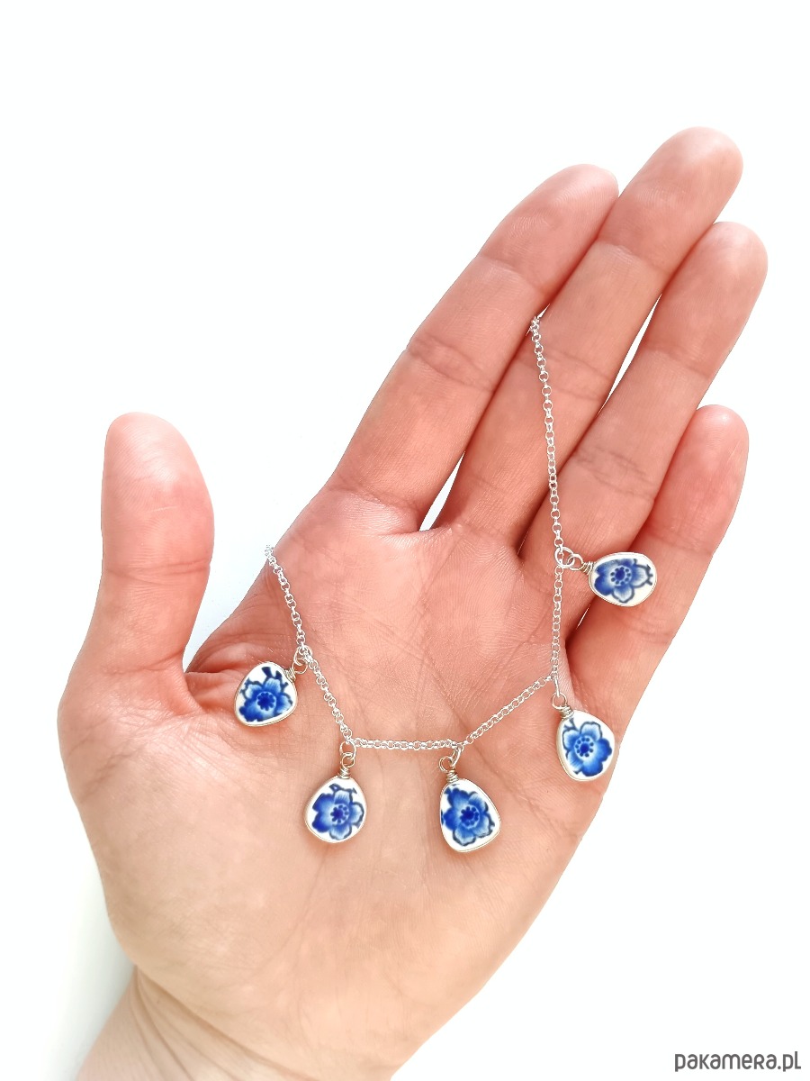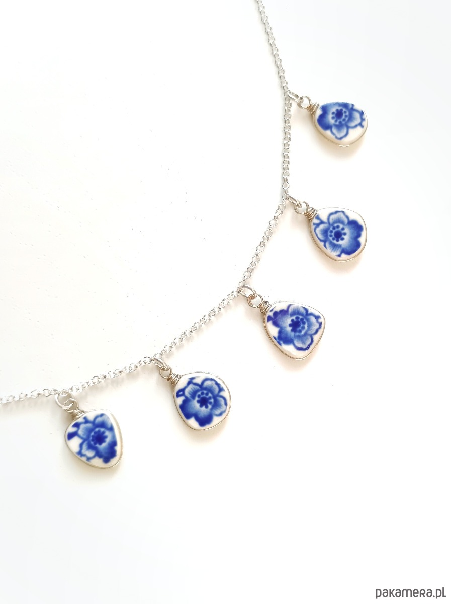Oto kolia - naszyjnik wieloelementowy, który wykonałam z fragmentów stłuczonego talerza Villeroy & Boch w kobaltowe kwiaty. Fragmenty ceramiki, czyli zawieszki oszlifowałam w nieregularne kształty, oprawiłam w drucik i połączyłam z łańcuszkiem (oprawa i łańcuszek ze srebra próby 925). Ceramikę zeszlifowałam również z grubości - jest cieńsza niż pierwotnie, dzięki czemu zawieszki nie są masywne. Brzegi i tył pokryłam lakierem, co sprawia, że nie brudzą się i nie chłoną wilgoci. Wymiary elementów ceramicznych: od 9 x 11 do 11 x 12 mm. Ilość zawieszek: 5 sztuk. Długość łańcuszka w całości: 45 cm. Unikat - każdy z moich wyrobów występuje w jednym egzemplarzu. Upcykling - nie reprodukuję wykorzystywanych wzorów, niczego nie domalowuję - wykorzystuję wyłącznie oryginalne naczynia i motywy, które się na nich znajdują.