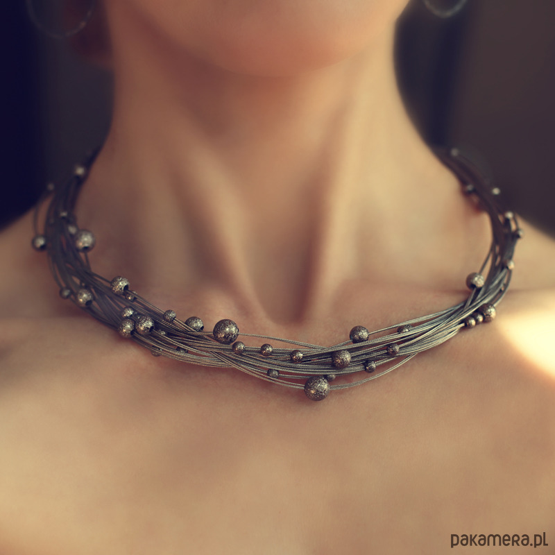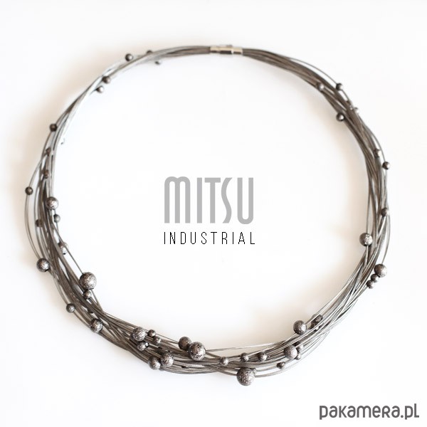 Kolia wykonana jest ze stalowych linek pokrytych nylonem oraz metalowych teksturowanych kul.