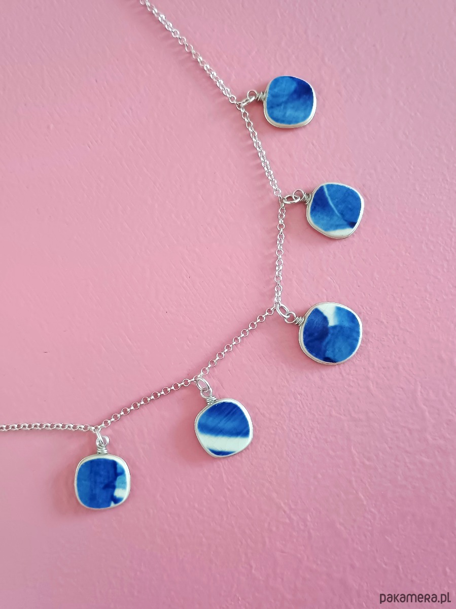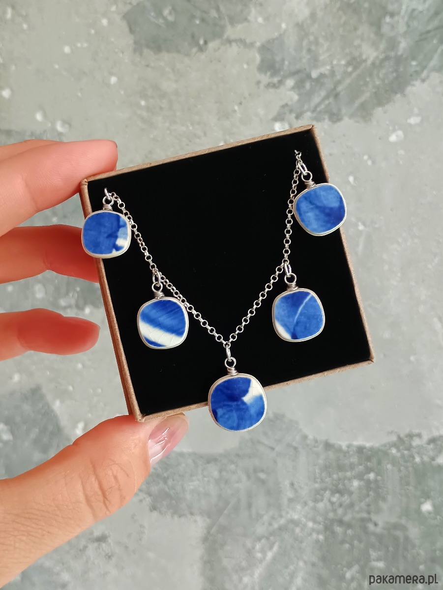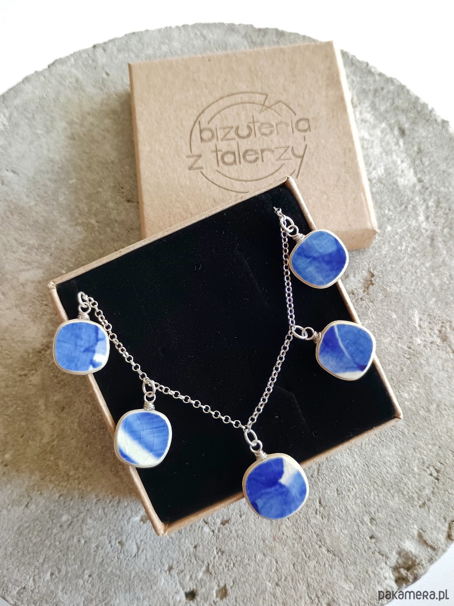 Historia fajansu włocławskiego sięga 1873 roku. Zakładów było kilka, zmieniali się właściciele i lokalizacje. Produkcja najbardziej rozwinęła się po II WŚ, kiedy w miejscowych zakładach powstawał nie tylko fajans, ale również porcelit i porcelana. Zróżnicowane było także wzornictwo - produkowano nie tylko naczynia, ale również elementy wyposażenia wnętrz (lampy, świeczniki, żyrandole). Mimo tej różnorodności, najbardziej rozpoznawalnym wyrobem z Włocławka jest talerz w ręcznie malowane kobaltowe kwiaty (z takich najchętniej korzystam :). I mimo, że najdłużej działająca fabryka zakończyła działalność w 1991 roku, dzięki lokalnym inicjatywom produkcja fajansu została wznowiona i trwa do dziś! Oto kolia - naszyjnik wieloelementowy, który wykonałam z fragmentów fajansu włocławskiego w kobaltowe wzory. Fragmenty, czyli zawieszki oszlifowałam w nieregularne kształty, oprawiłam w drucik i połączyłam z łańcuszkiem (oprawa i łańcuszek ze srebra próby 925). Ceramikę zeszlifowałam również z grubości - jest cieńsza niż pierwotnie, dzięki czemu zawieszki nie są masywne. Brzegi pokryłam lakierem, co sprawia, że nie brudzą się i nie chłoną wilgoci. Wymiary elementów ceramicznych: od 12 x 12 do 14 x 14 mm. Ilość zawieszek: 5 sztuk. Długość łańcuszka w całości: 45 cm. Unikat - każdy z moich wyrobów występuje w jednym egzemplarzu. Upcykling - nie reprodukuję wykorzystywanych wzorów, niczego nie domalowuję - wykorzystuję wyłącznie oryginalne naczynia i motywy, które się na nich znajdują.