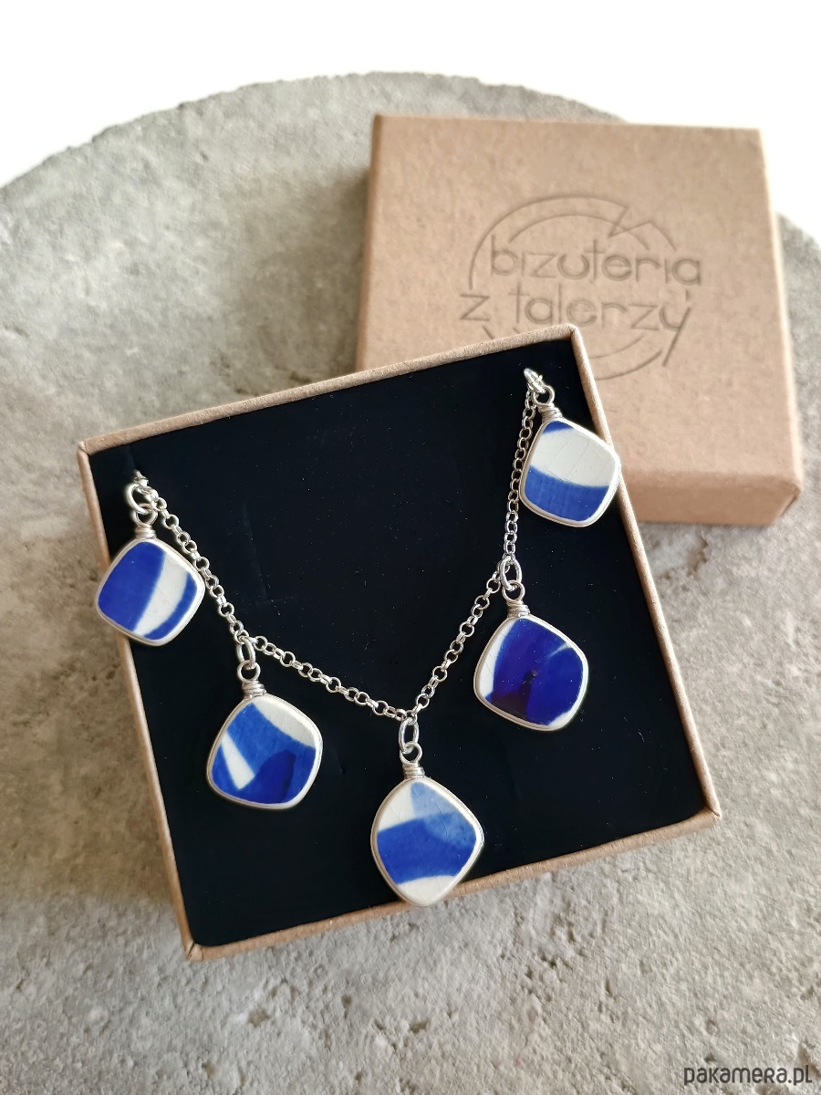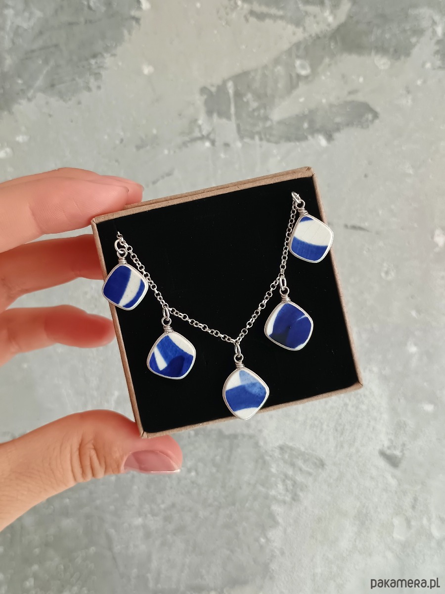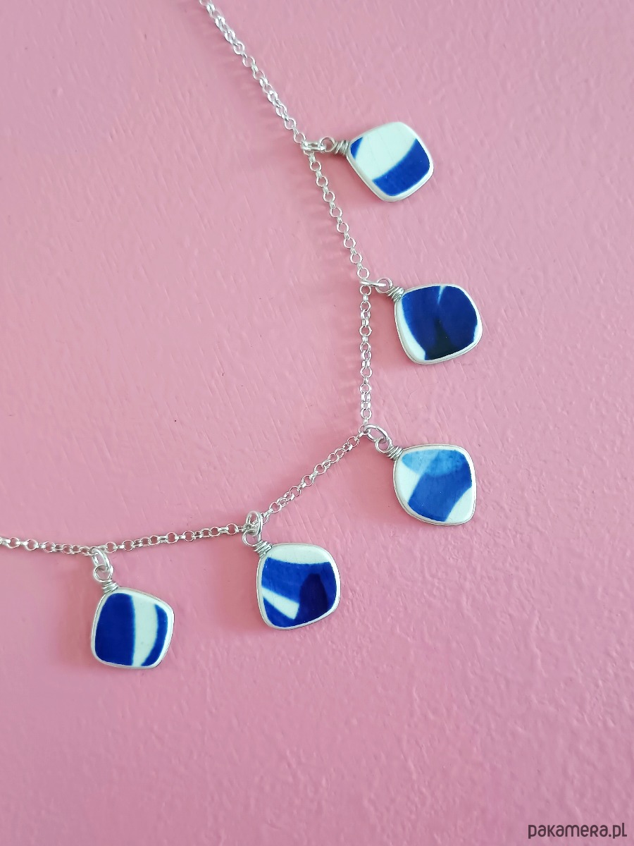 Historia fajansu włocławskiego sięga 1873 roku. Zakładów było kilka, zmieniali się właściciele i lokalizacje. Produkcja najbardziej rozwinęła się po II WŚ, kiedy w miejscowych zakładach powstawał nie tylko fajans, ale również porcelit i porcelana. Zróżnicowane było także wzornictwo - produkowano nie tylko naczynia, ale również elementy wyposażenia wnętrz (lampy, świeczniki, żyrandole). Mimo tej różnorodności, najbardziej rozpoznawalnym wyrobem z Włocławka jest talerz w ręcznie malowane kobaltowe kwiaty (z takich najchętniej korzystam :). I mimo, że najdłużej działająca fabryka zakończyła działalność w 1991 roku, dzięki lokalnym inicjatywom produkcja fajansu została wznowiona i trwa do dziś! Oto kolia - naszyjnik wieloelementowy, który wykonałam z fragmentów fajansu włocławskiego w kobaltowe wzory. Fragmenty, czyli zawieszki oszlifowałam w nieregularne kształty, oprawiłam w drucik i połączyłam z łańcuszkiem (oprawa i łańcuszek ze srebra próby 925). Ceramikę zeszlifowałam również z grubości - jest cieńsza niż pierwotnie, dzięki czemu zawieszki nie są masywne. Brzegi pokryłam lakierem, co sprawia, że nie brudzą się i nie chłoną wilgoci. Wymiary elementów ceramicznych: od 12 x 13 do 13 x 14 mm. Ilość zawieszek: 5 sztuk. Długość łańcuszka w całości: 45 cm. Unikat - każdy z moich wyrobów występuje w jednym egzemplarzu. Upcykling - nie reprodukuję wykorzystywanych wzorów, niczego nie domalowuję - wykorzystuję wyłącznie oryginalne naczynia i motywy, które się na nich znajdują.