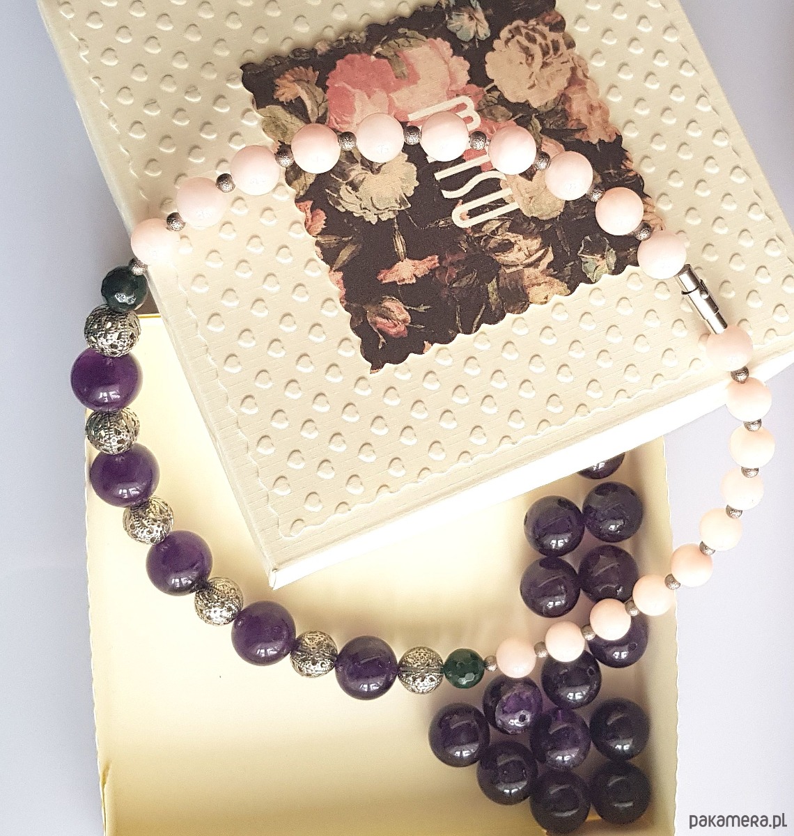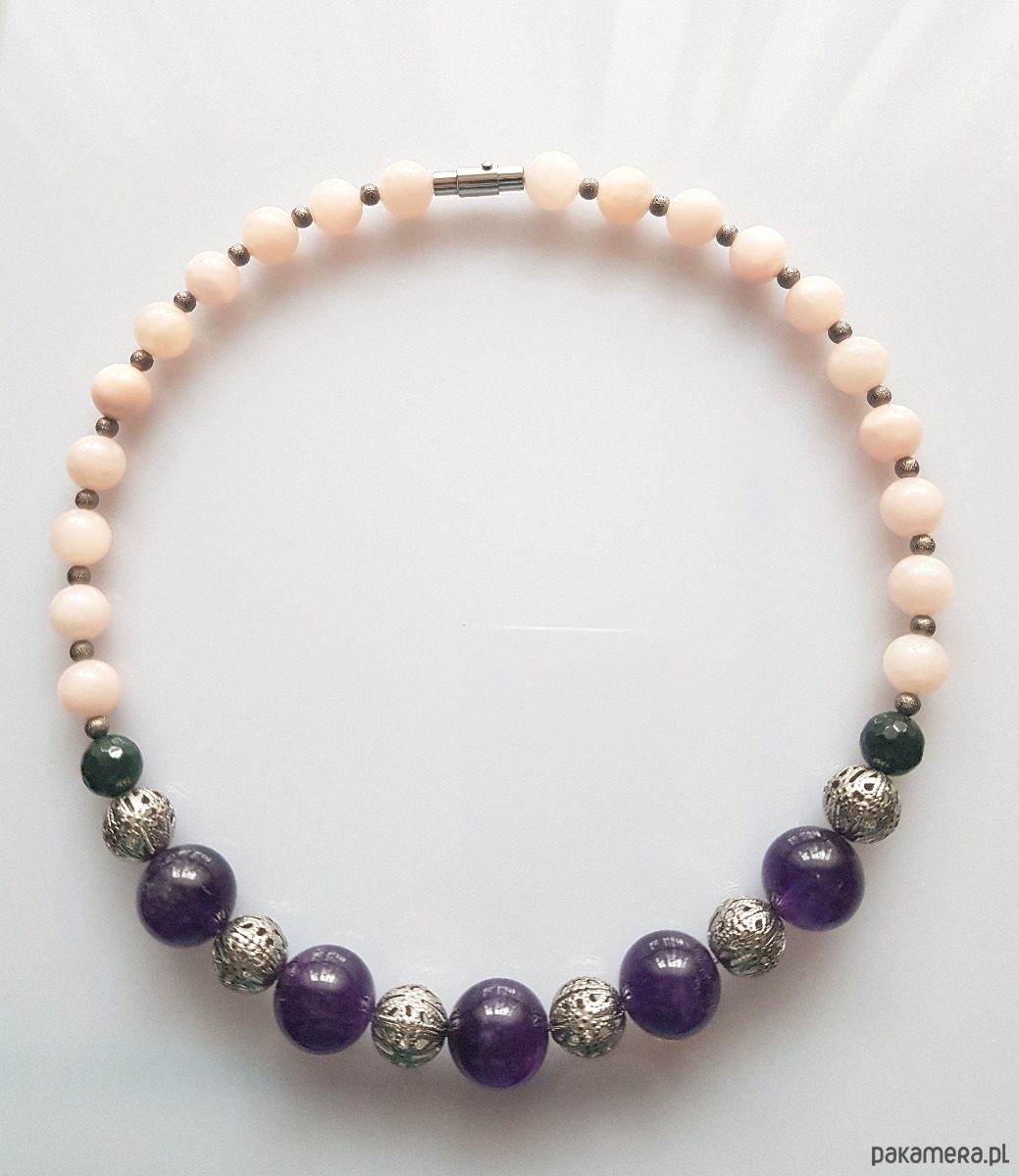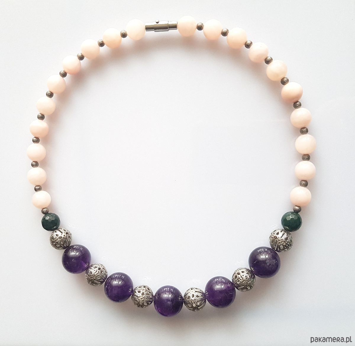 Klasyczna, elegancka kolia z dużymi kulami ametystu, różowym jadeitem i agatem mszystym.