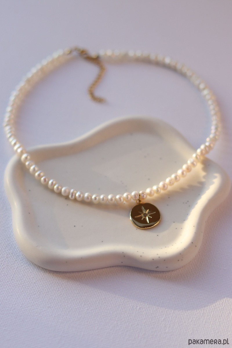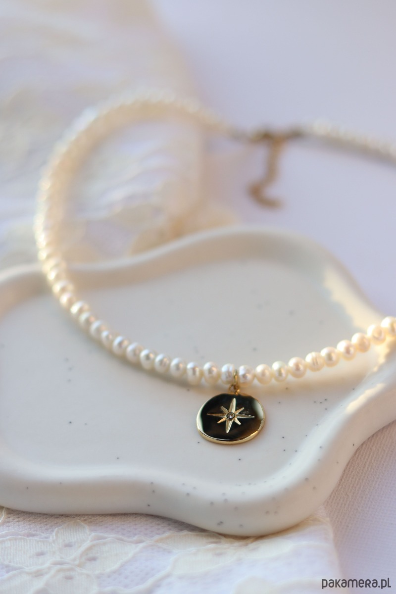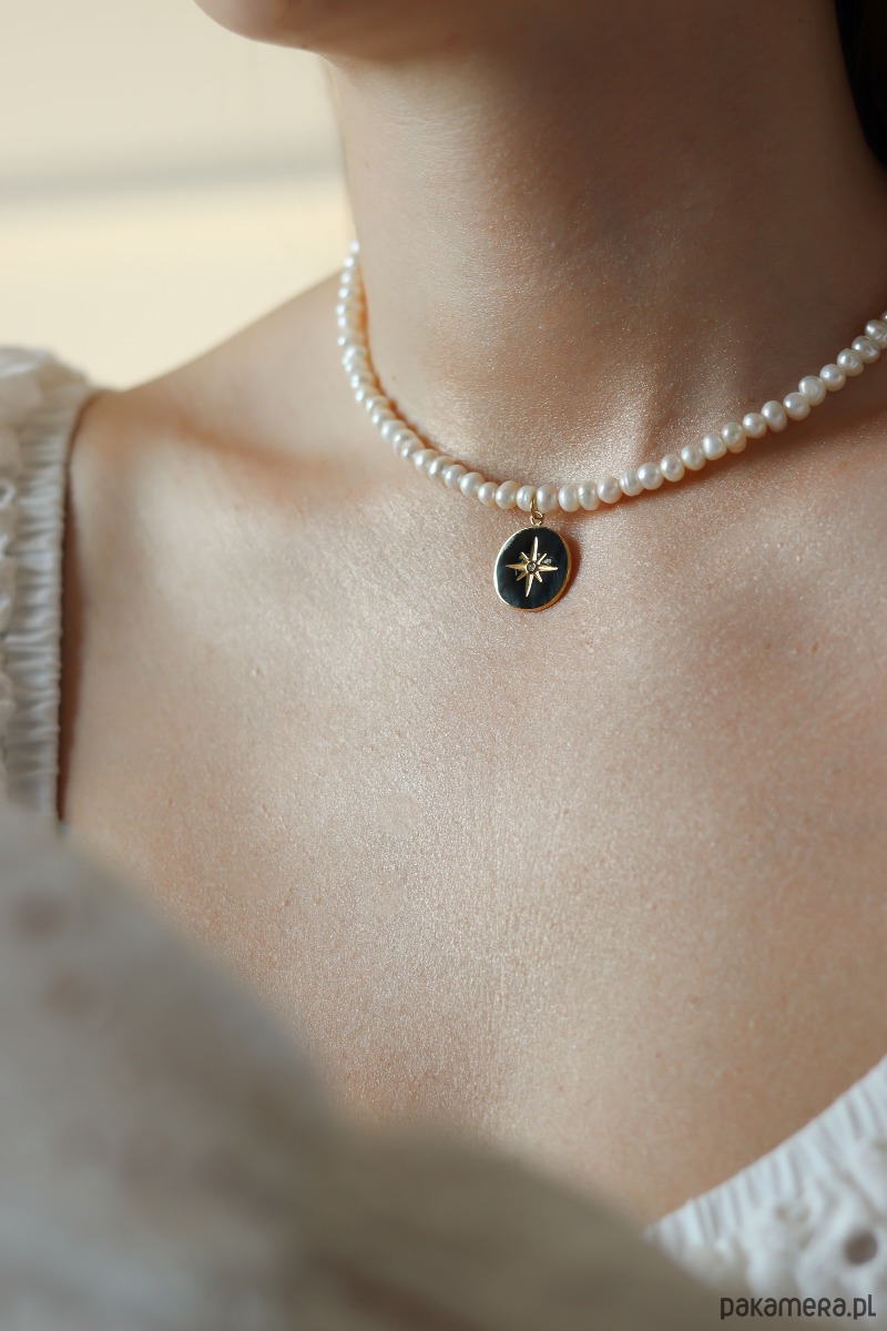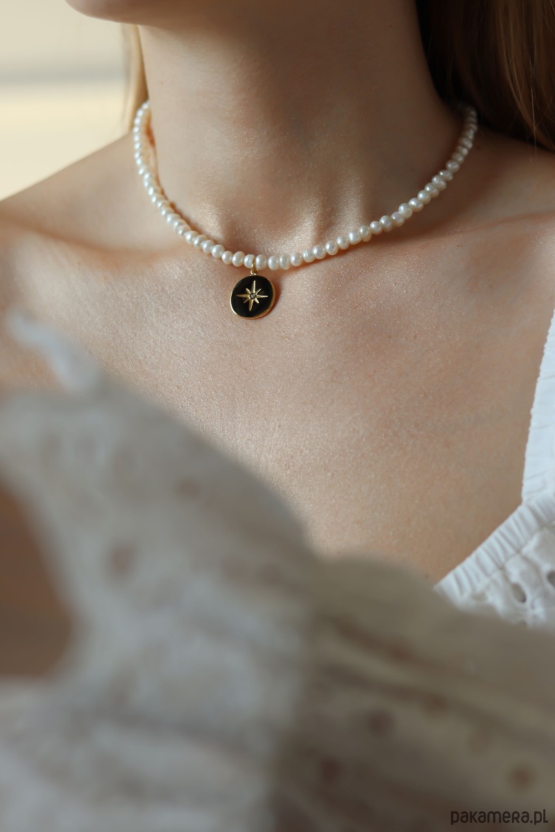 Naszyjnik wykończony jest stalą chirurgiczną, pokrytą delikatnym złoceniem, co gwarantuje trwałość i odporność na codzienne użytkowanie, jednocześnie nadając mu elegancki wygląd. W centralnym miejscu naszyjnika znajduje się okrągła zawieszka z różą wiatrów. Róża wiatrów symbolizuje kierunek, przewodnictwo i poszukiwanie nowych ścieżek w życiu, często kojarzona jest z odkrywaniem nieznanego i podejmowaniem ważnych decyzji. Jest również znakiem ochrony i wsparcia w podróży, zarówno dosłownej, jak i duchowej. Naszyjnik ten to połączenie klasyki i emocji, które podkreślają indywidualność noszącej go osoby.