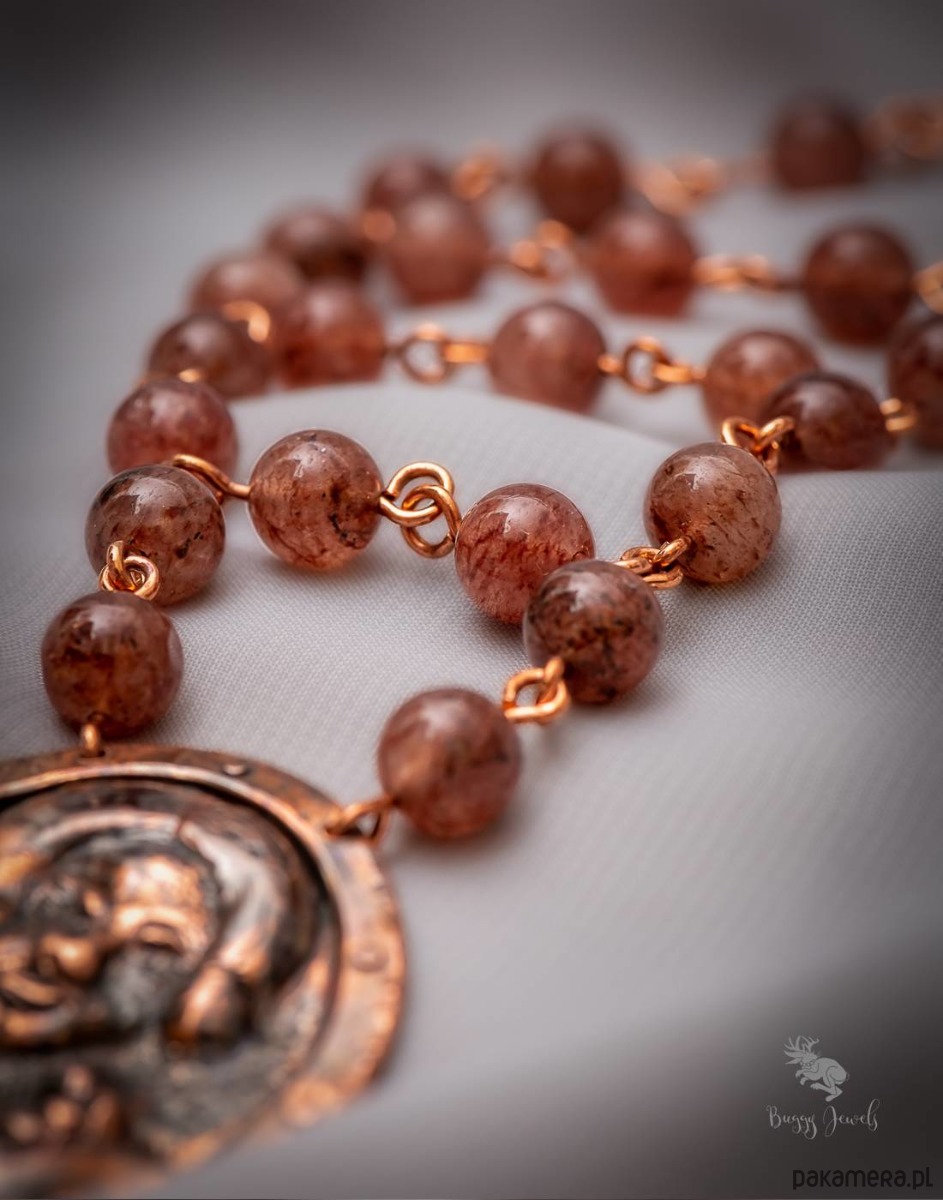 Naszyjnik wykonany jest z naturalnego kwarcu truskawkowego. Długość 55 cm