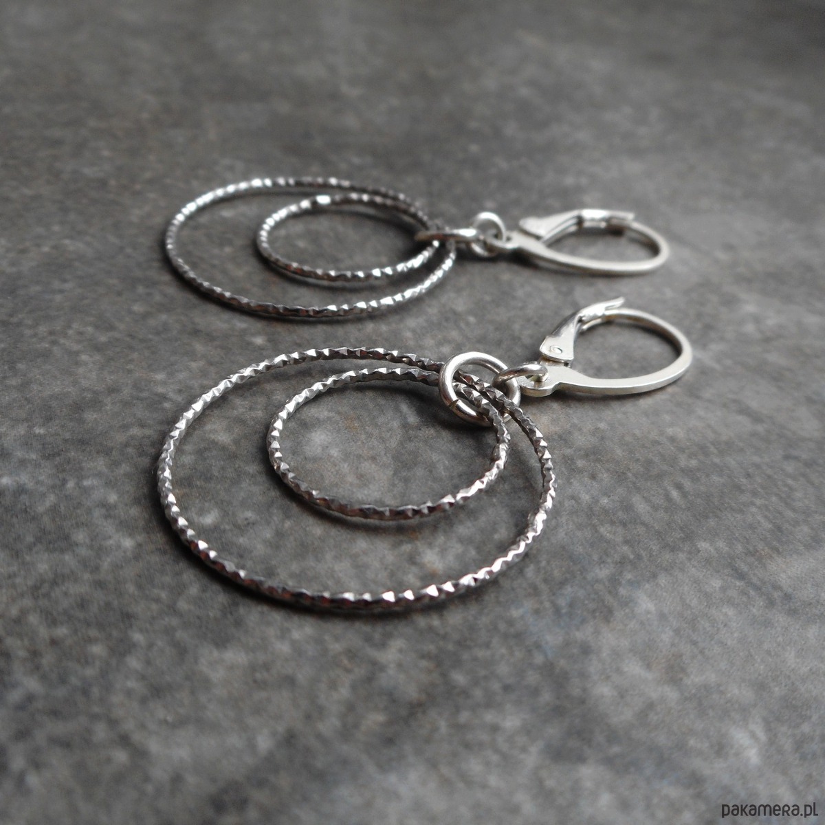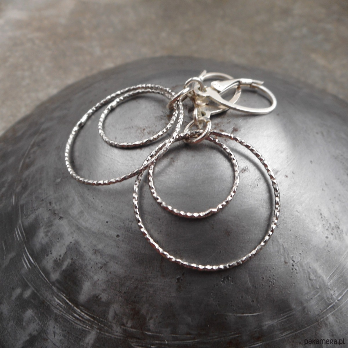 Stylowe kolczyki ze szlachetnego srebra ; wygodne, nie obciążające ucha, w formie ruchomych kół, kompozycja lekka i zwiewna.