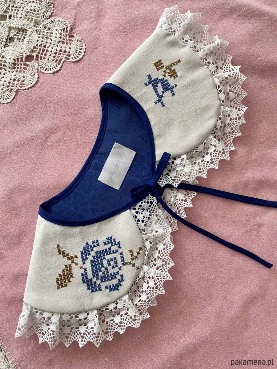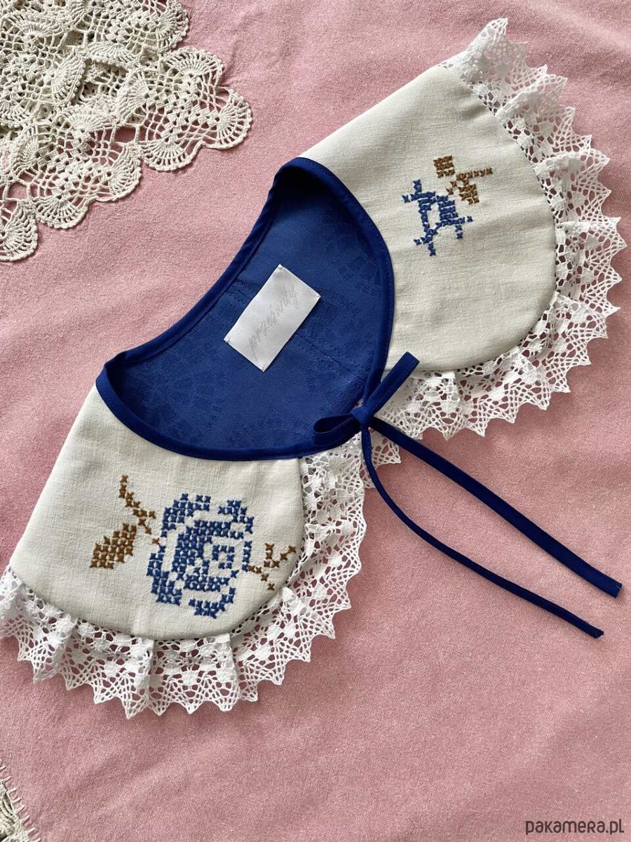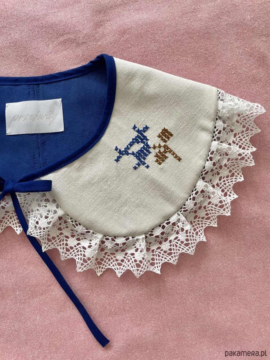 Każdy kołnierzyk powstaje z tkanin z drugiego obiegu, dlatego mogą pojawić się na nich niewielkie ślady użytkowania. Zawsze staramy się je odczarować: haftem, kompozycją, detalem. Prosimy o wyrozumiałość, to naturalna część pracy z materiałami, które już miały swoje życie.