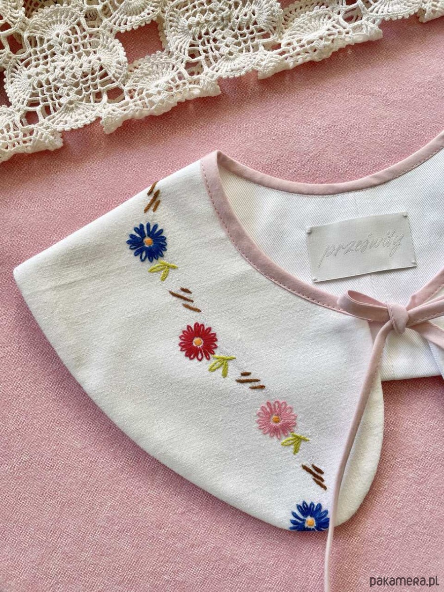 Każdy kołnierzyk powstaje z tkanin z drugiego obiegu, dlatego mogą pojawić się na nich niewielkie ślady użytkowania. Zawsze staramy się je odczarować: haftem, kompozycją, detalem. Prosimy o wyrozumiałość, to naturalna część pracy z materiałami, które już miały swoje życie.