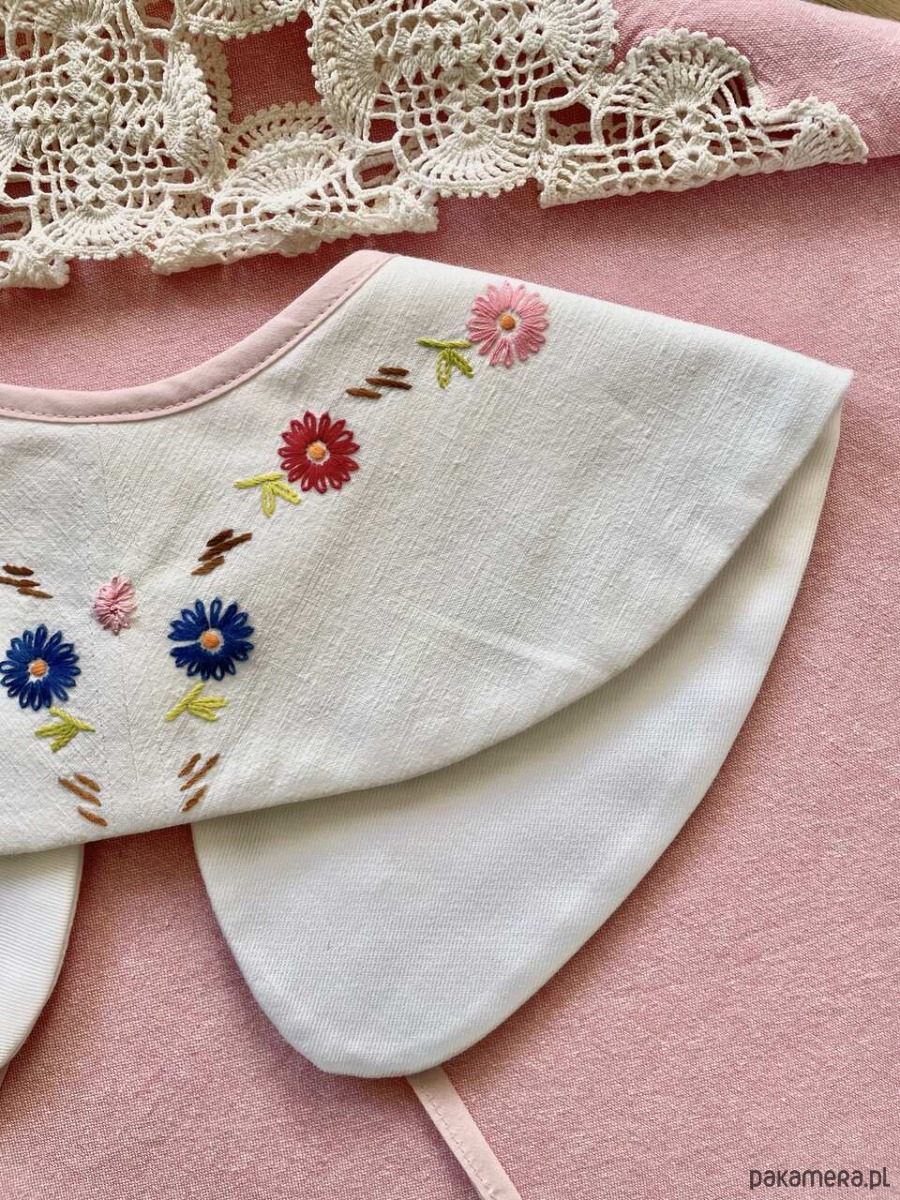 Kołnierzyk uszyty ręcznie z bawełnianego obrusa z kwiatowym haftem z drugiego obiegu.