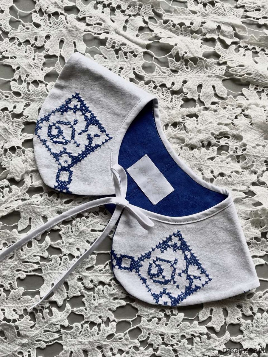 Kołnierzyk uszyty ręcznie z bawełnianego obrusa z kwiatowym haftem z drugiego obiegu.