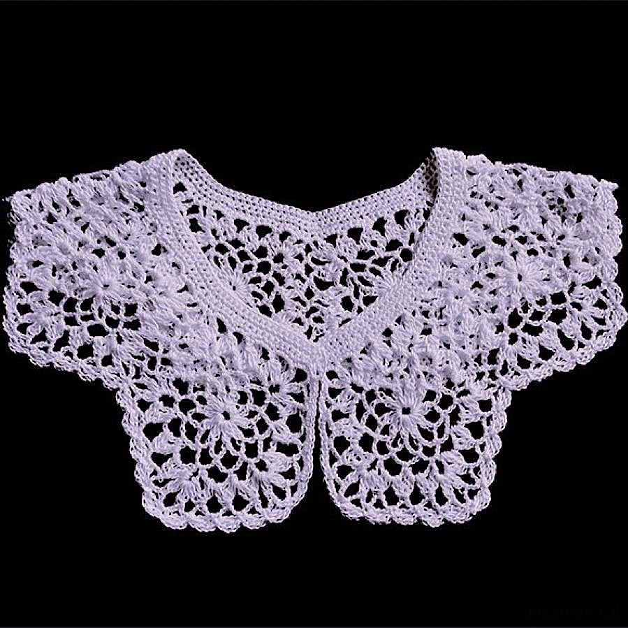Piękny koronkowy kołnierzyk wykonany na szydełku z kordonku w kolorze białym. Całość powstała z motywów kwiatowych. Idealny do ozdobienia sweterka, bluzki czy sukienki. Zapinany na guziczek. Obwód 46cm. Prać ręcznie w temp. 30st.C, suszyć w stanie rozłożonym.