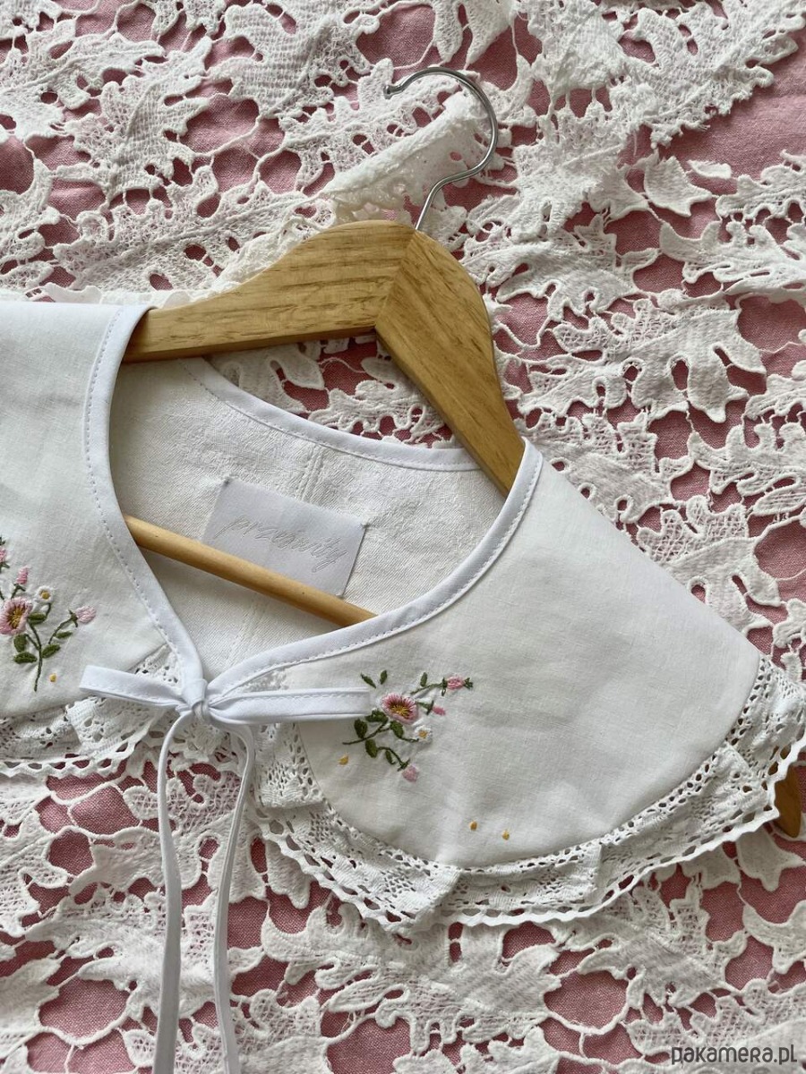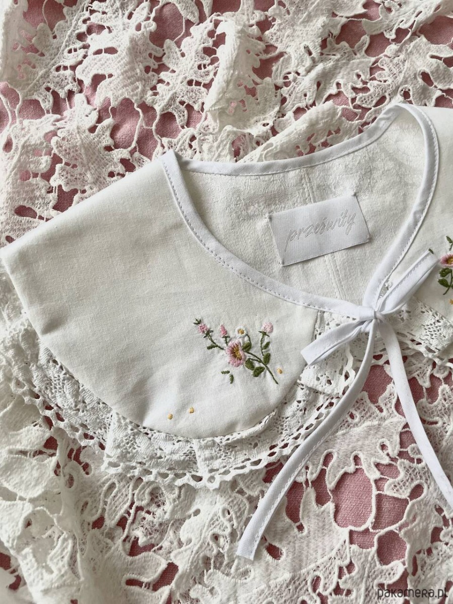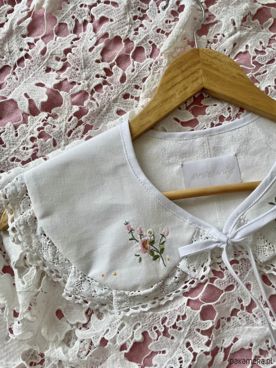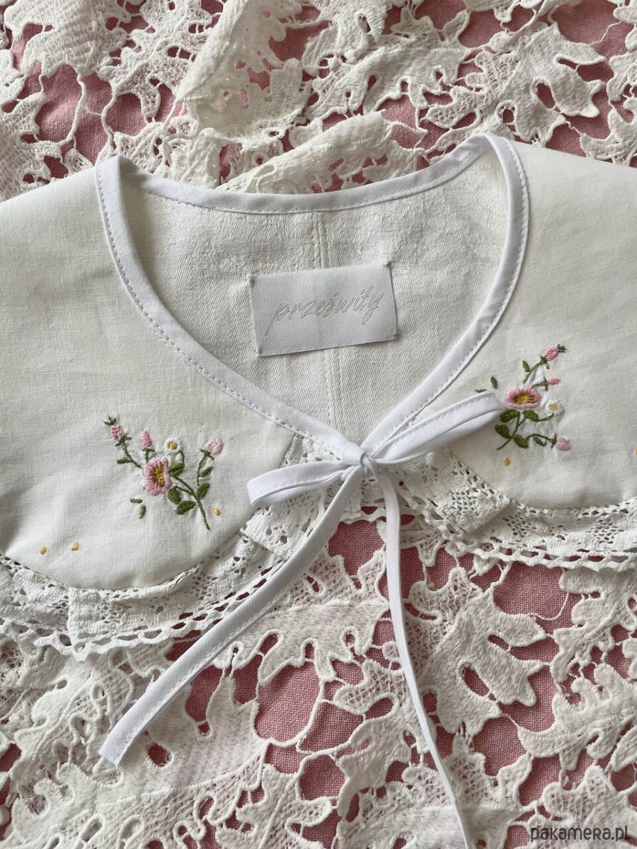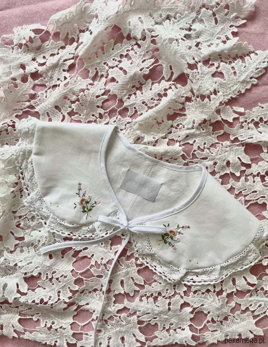 Kołnierzyk uszyty ręcznie z bawełnianego obrusa z kwiatowym haftem z drugiego obiegu.