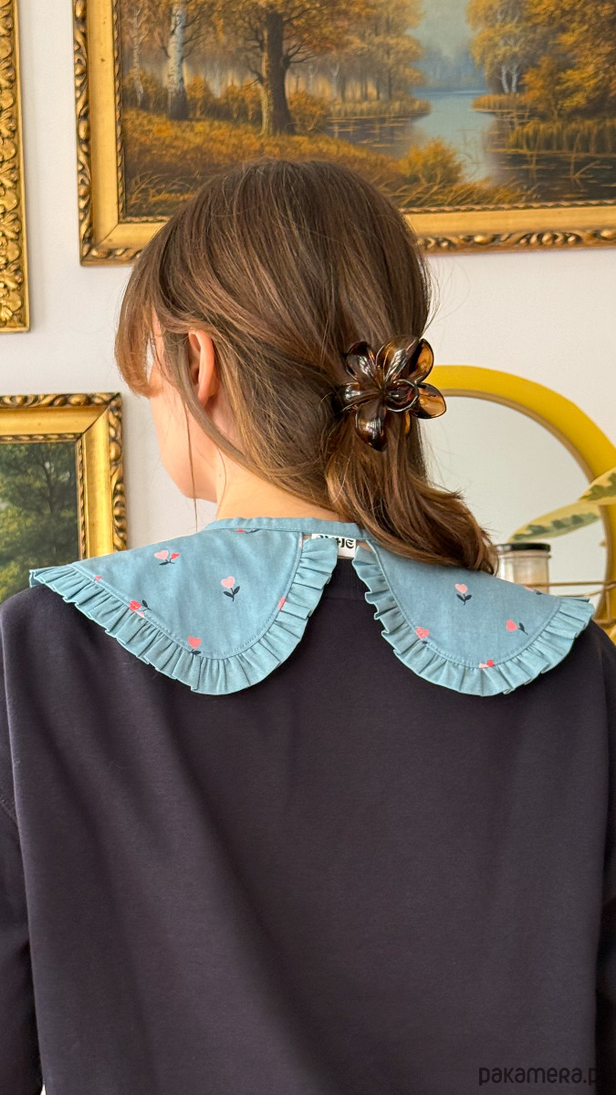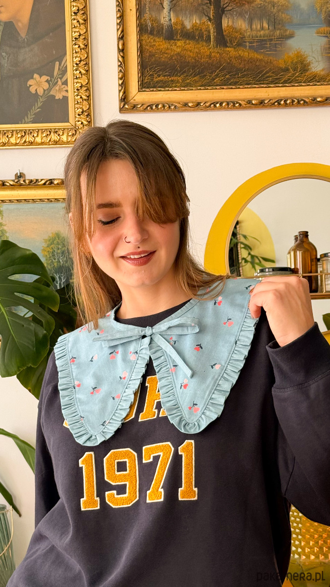 Wiązany kołnierzyk wykonany z jasnego jeansu drukowanego w serduszka/kwiatki.