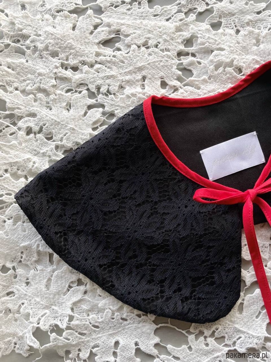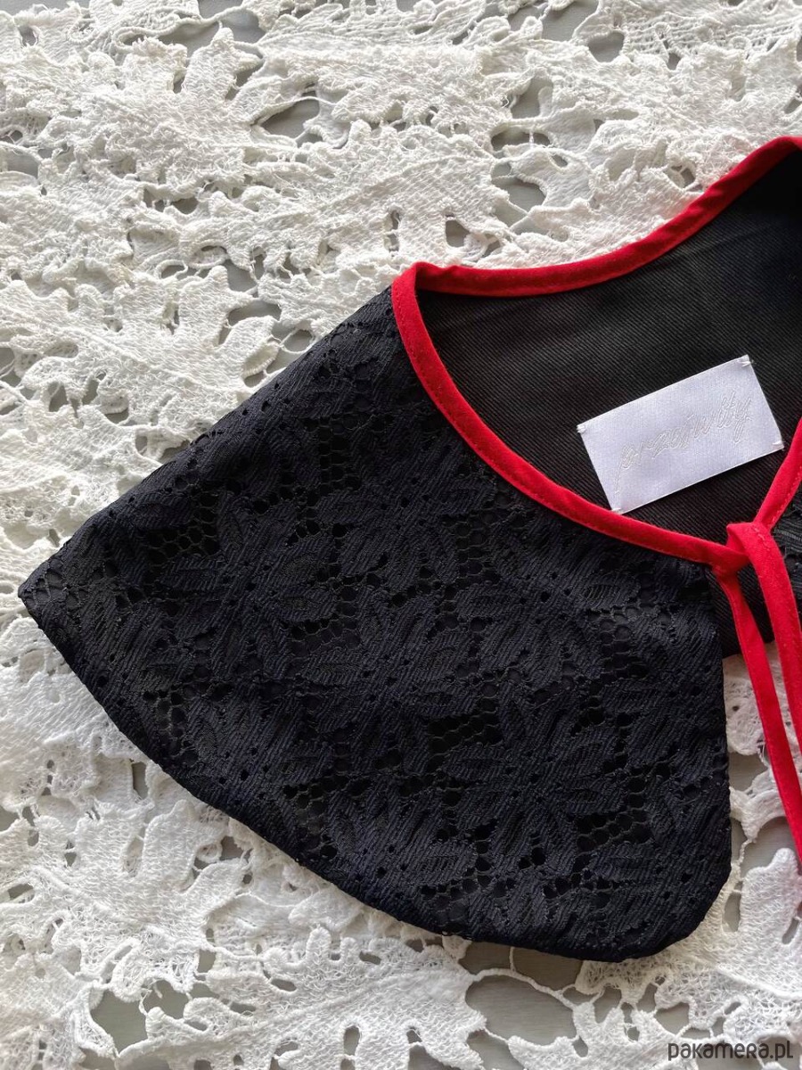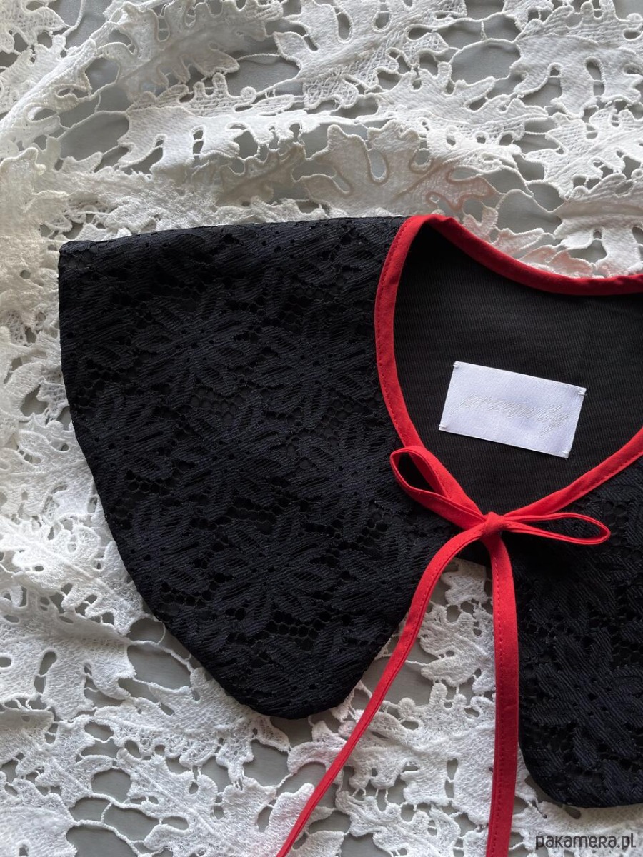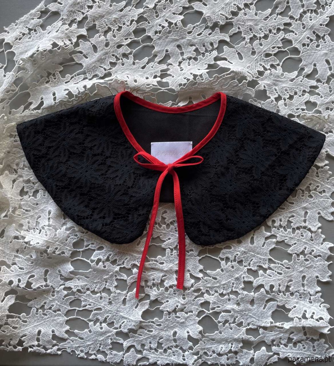 Kołnierzyk uszyty ręcznie z czarnej firanki z drugiego obiegu z bawełnianą podszewką.
