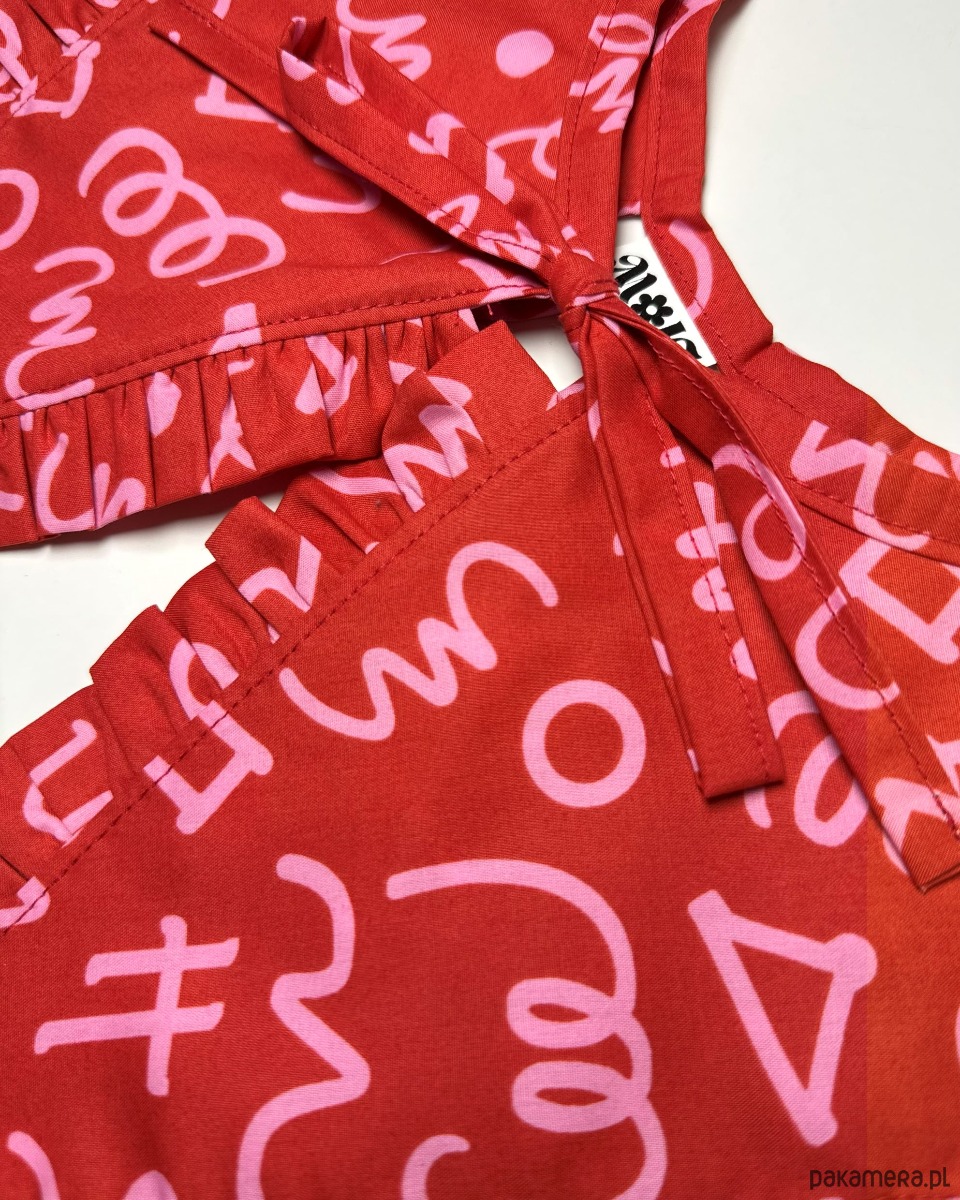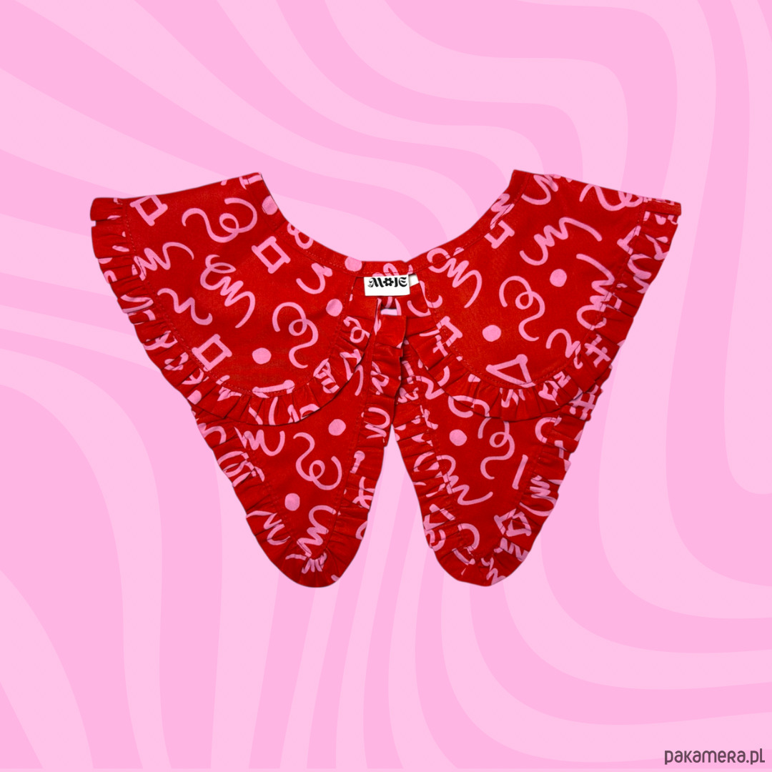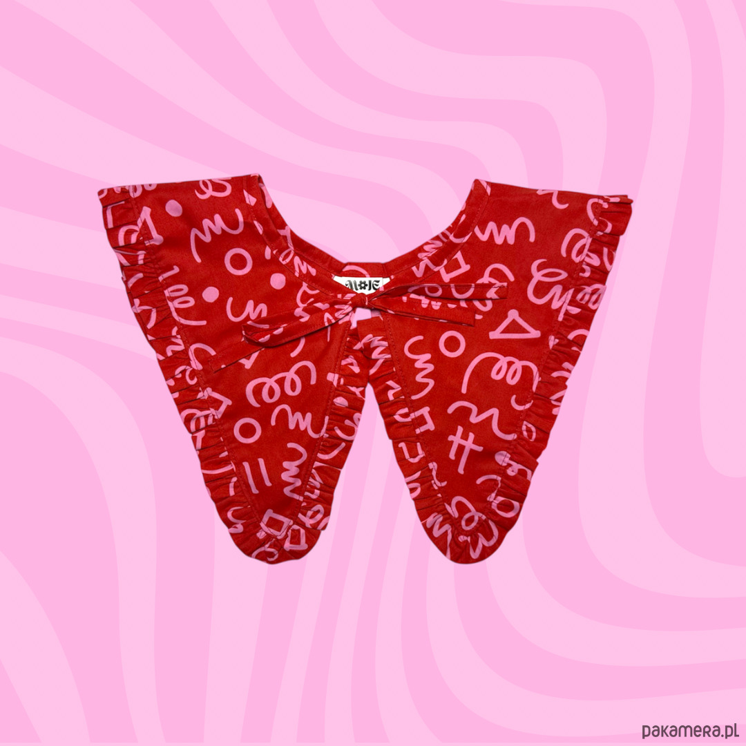 Wiązany kołnierzyk wykonany z czerwonej tkaniny bawełnianej drukowanej w różowe wzorki.