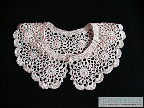 Piękny koronkowy kołnierzyk wykonany na szydełku z kordonku w kolorze ecru. Całość powstała z motywów kwiatowych. Idealny do ozdobienia sweterka, bluzki czy sukienki. Obwód 46cm. Prać ręcznie w temp. 30st.C, suszyć w stanie rozłożonym.