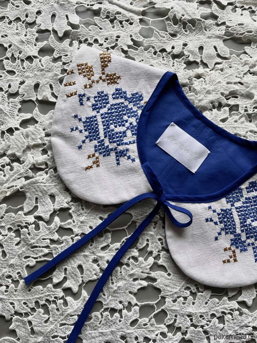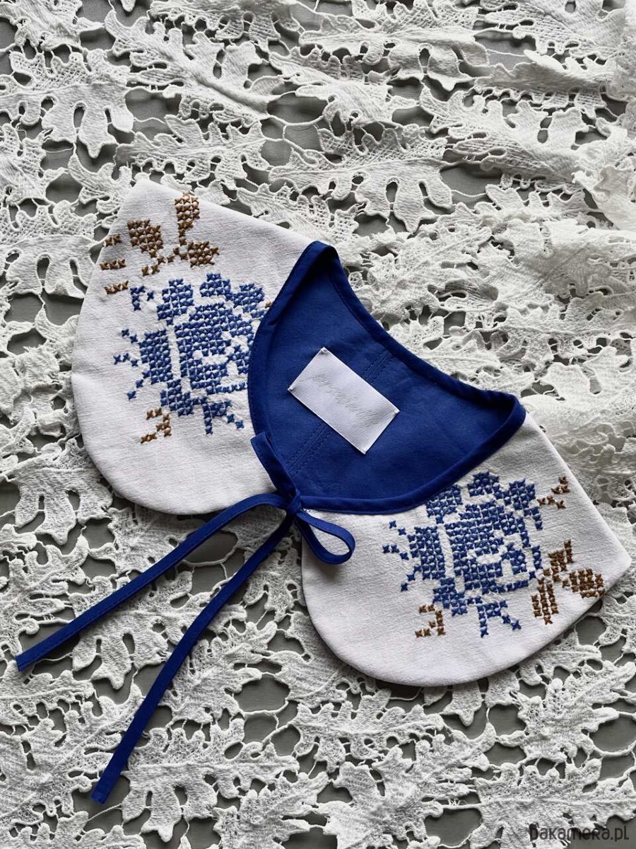 Kołnierzyk uszyty ręcznie z bawełnianego obrusa z kwiatowym haftem z drugiego obiegu.