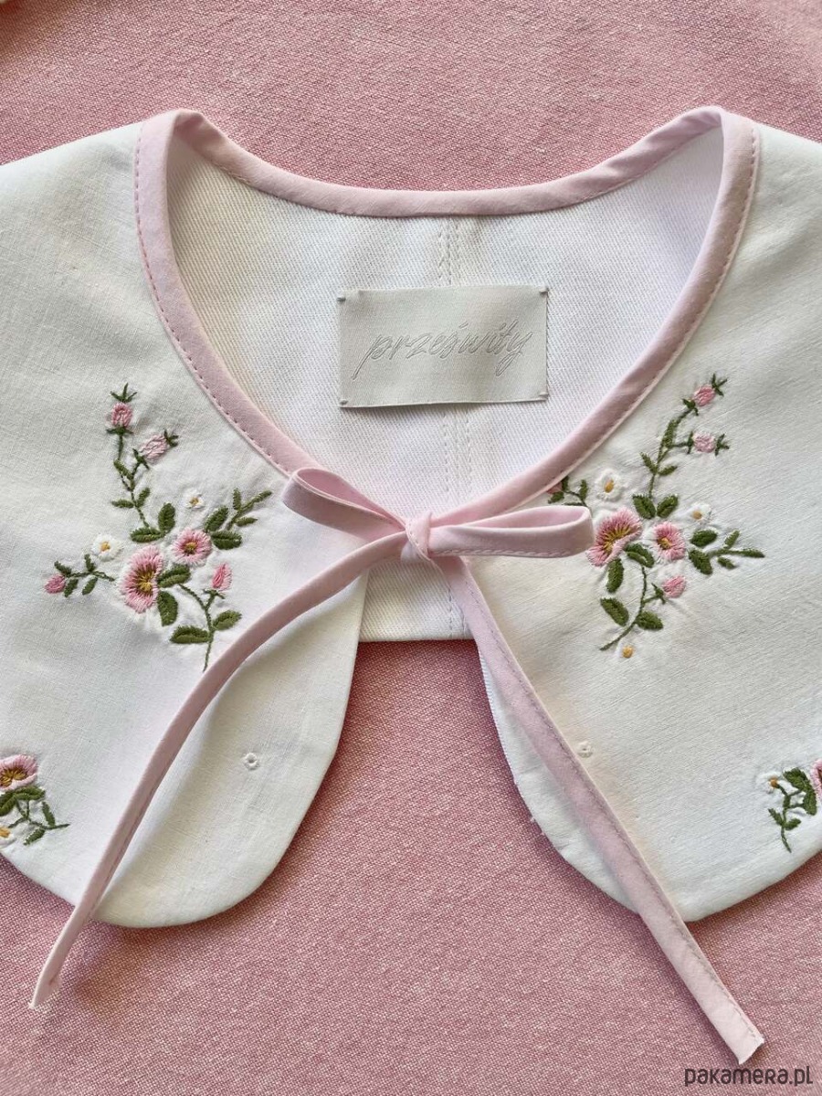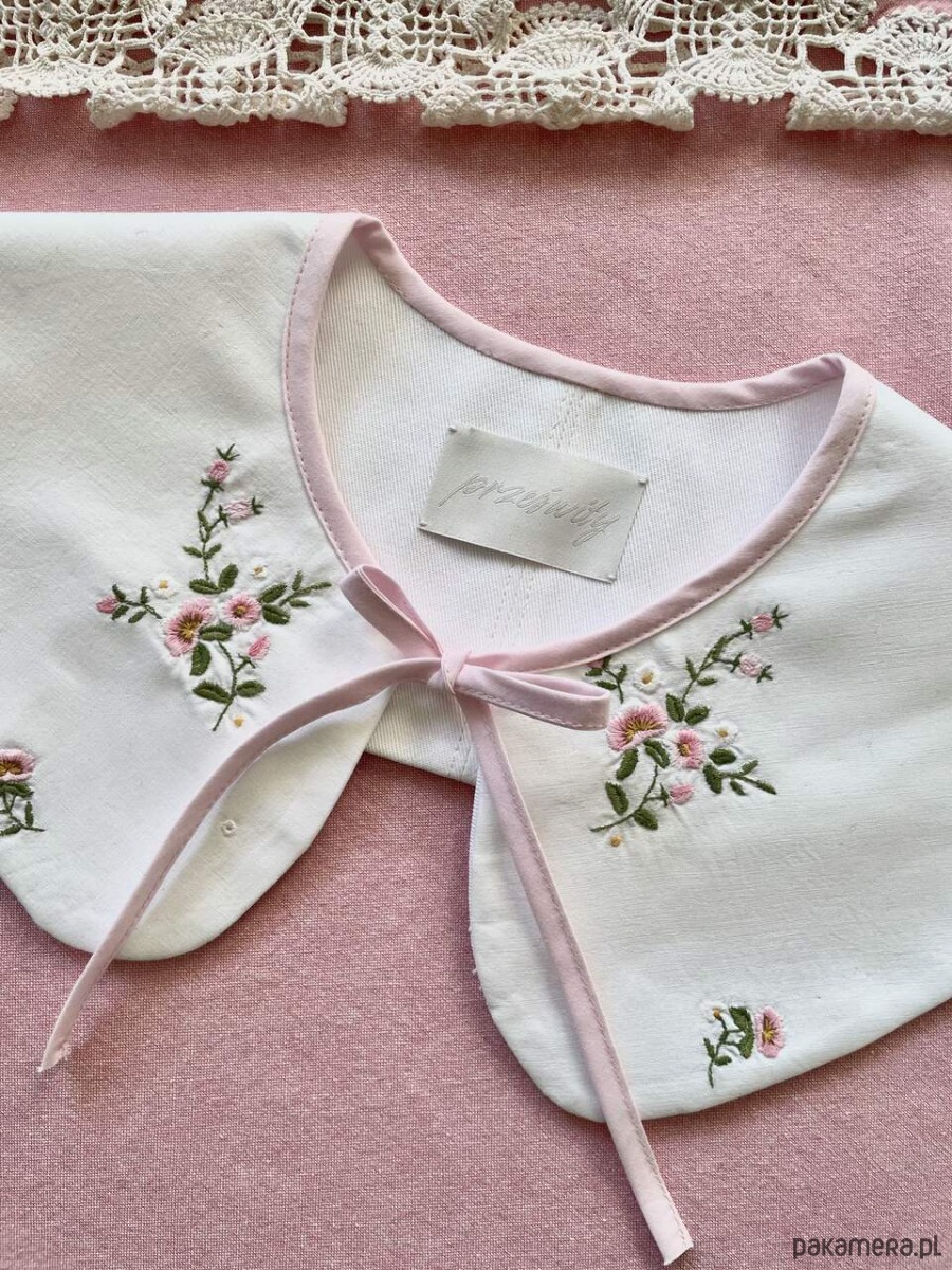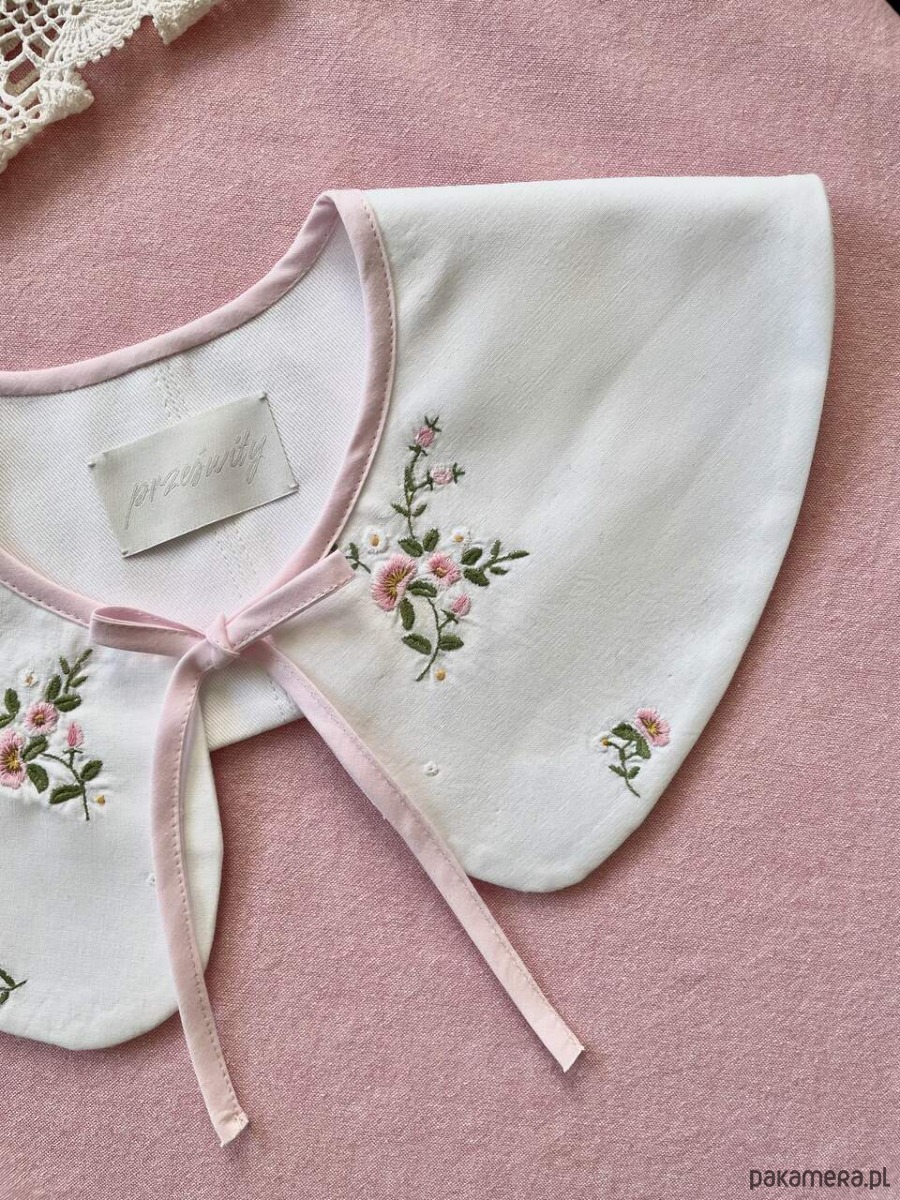 Kołnierzyk uszyty ręcznie z bawełnianego obrusa z kwiatowym haftem z drugiego obiegu.
