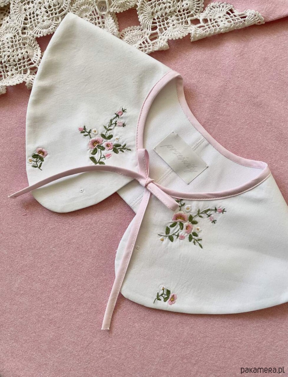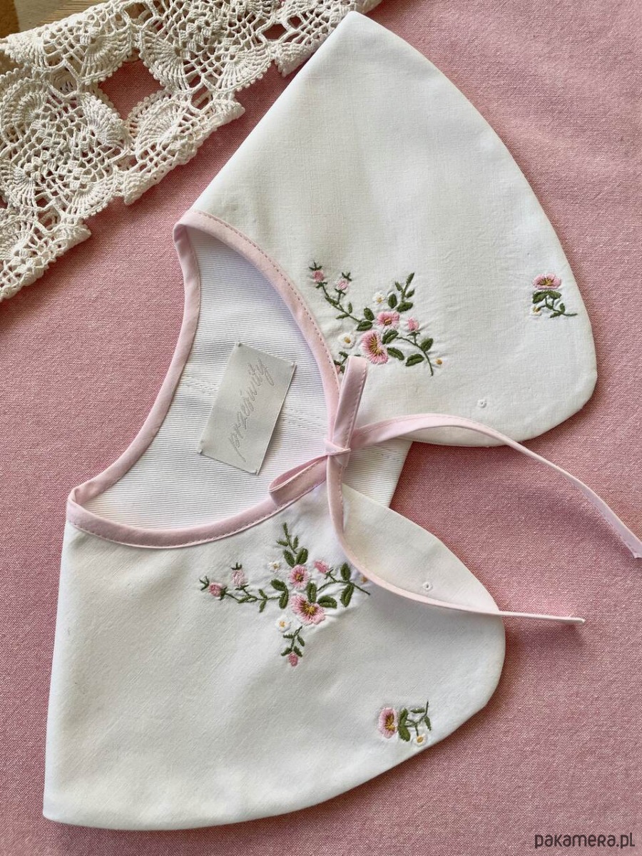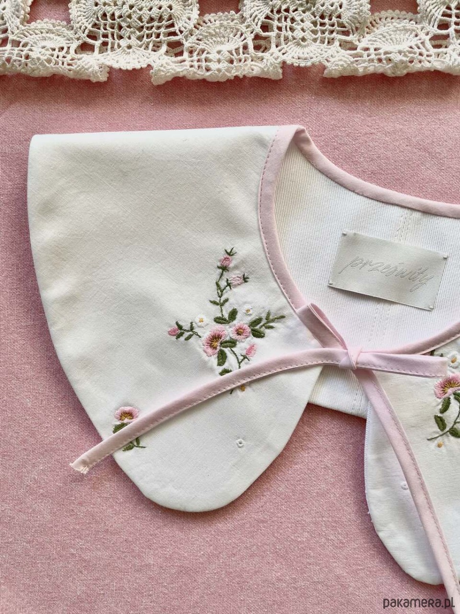 Kołnierzyk uszyty ręcznie z bawełnianego obrusa z kwiatowym haftem z drugiego obiegu.