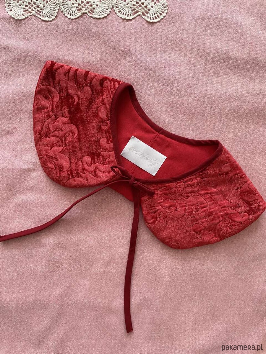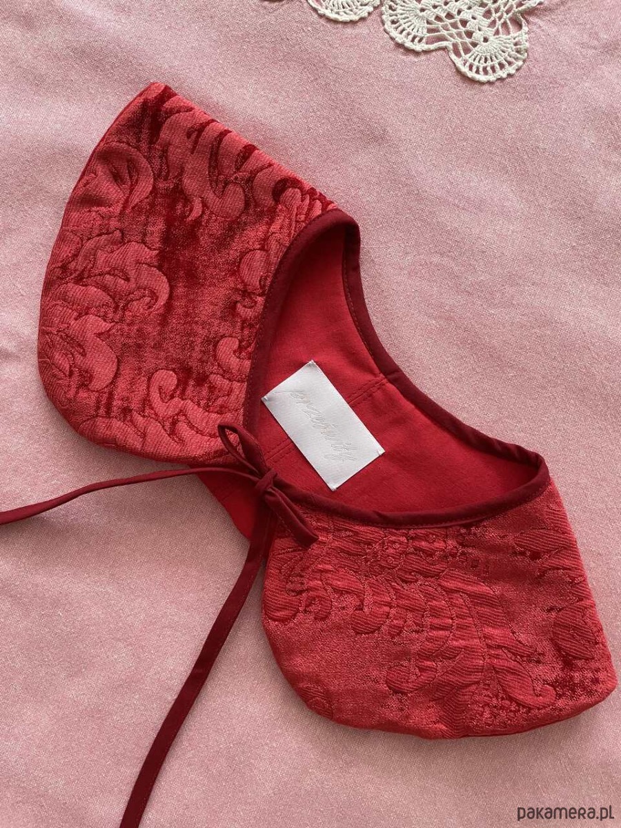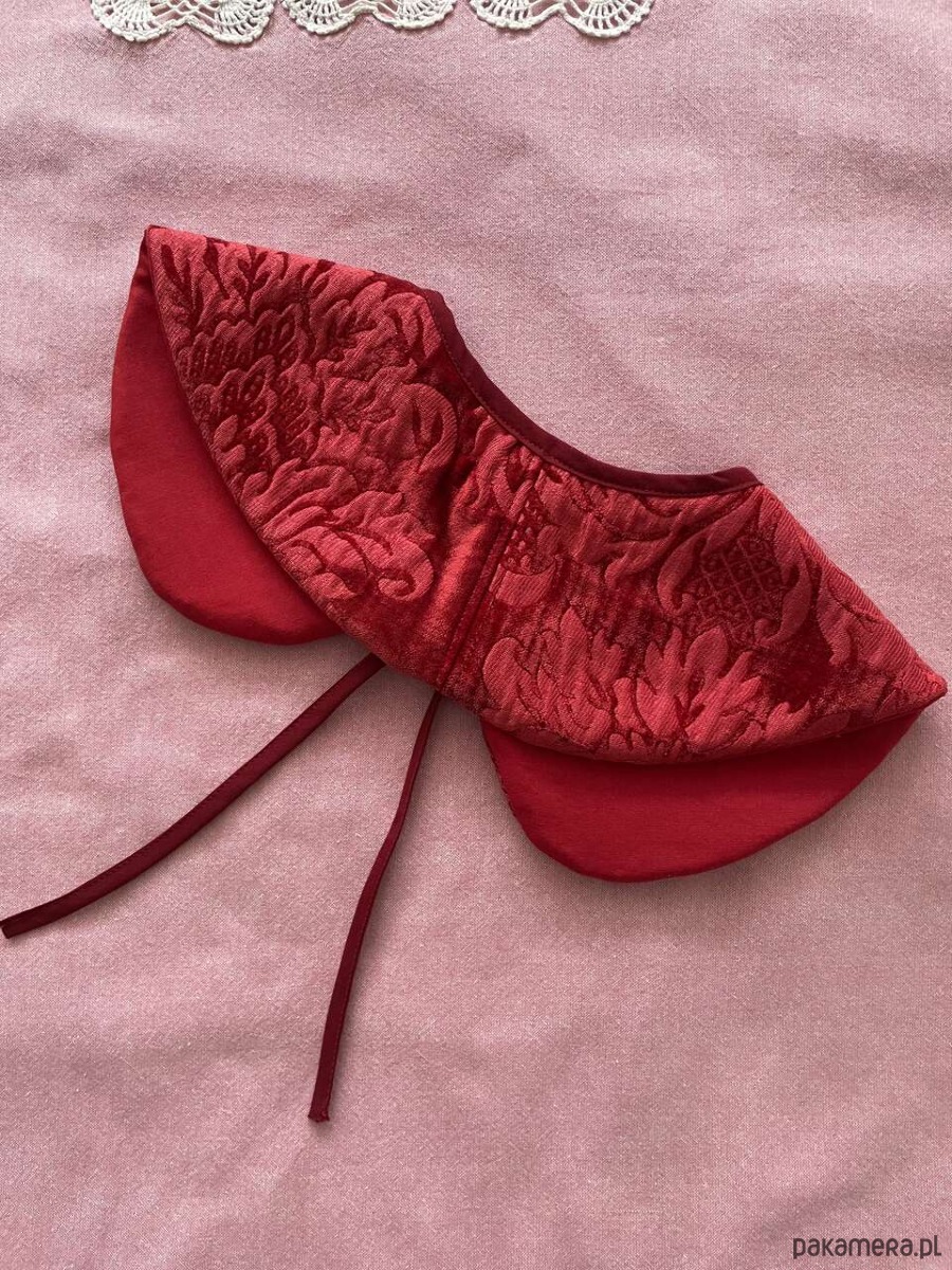Kołnierzyk uszyty ręcznie z welurowej tkaniny ze wzorem żakardowym z drugiego obiegu.