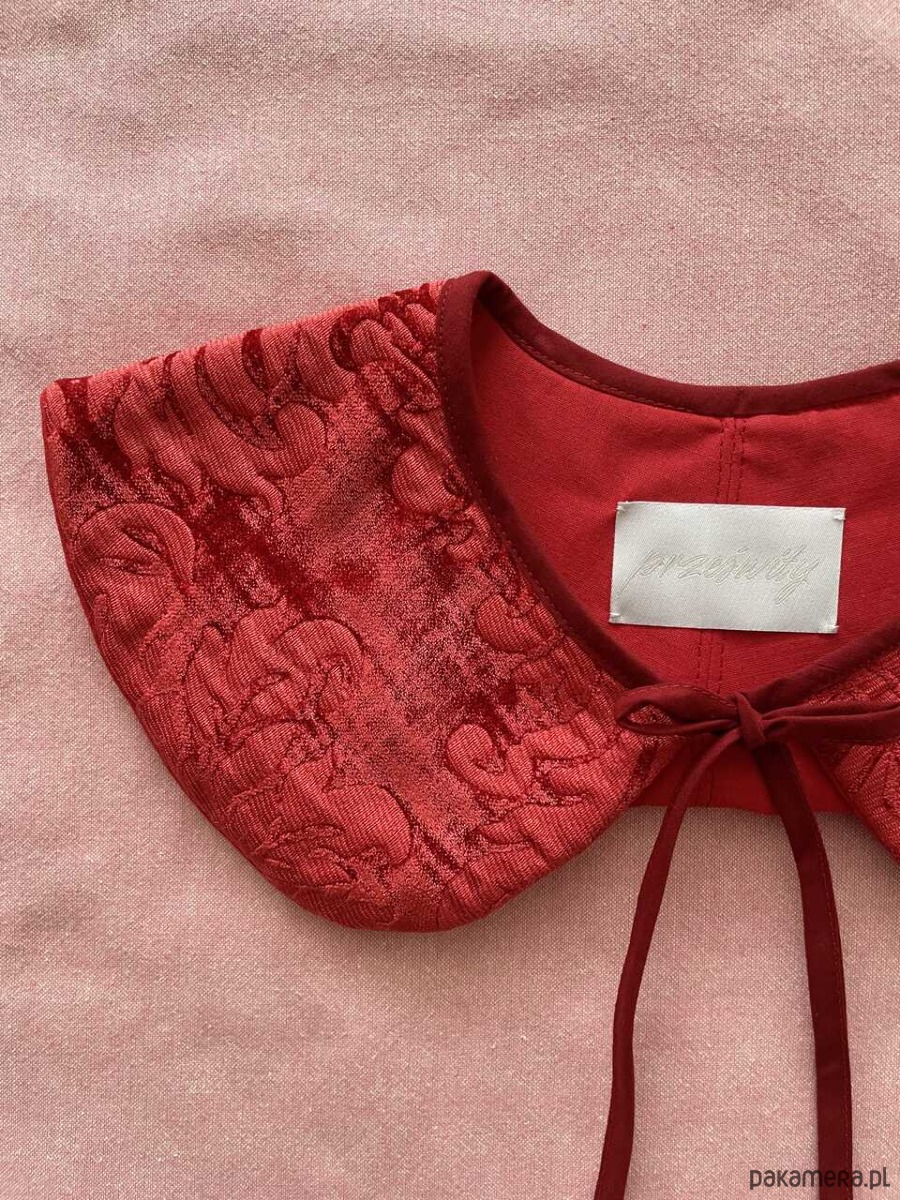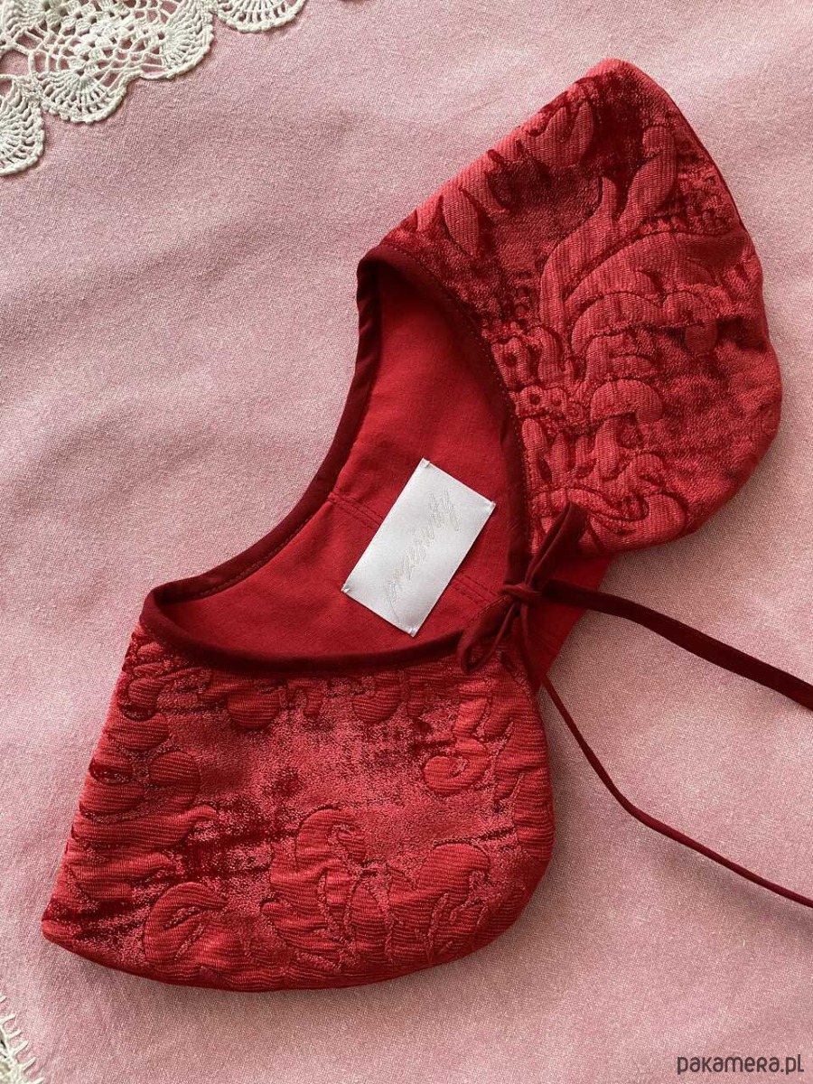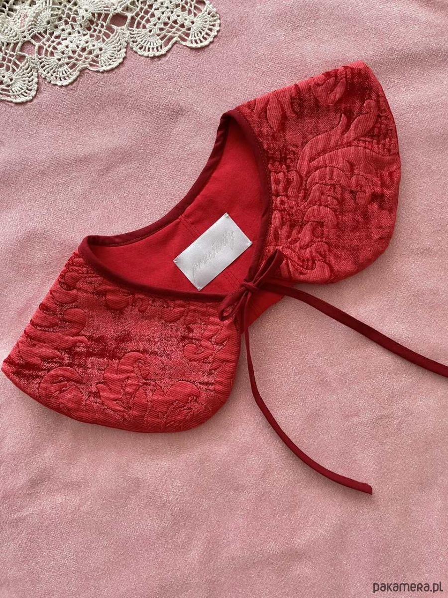 Kołnierzyk uszyty ręcznie z welurowej tkaniny ze wzorem żakardowym z drugiego obiegu.
