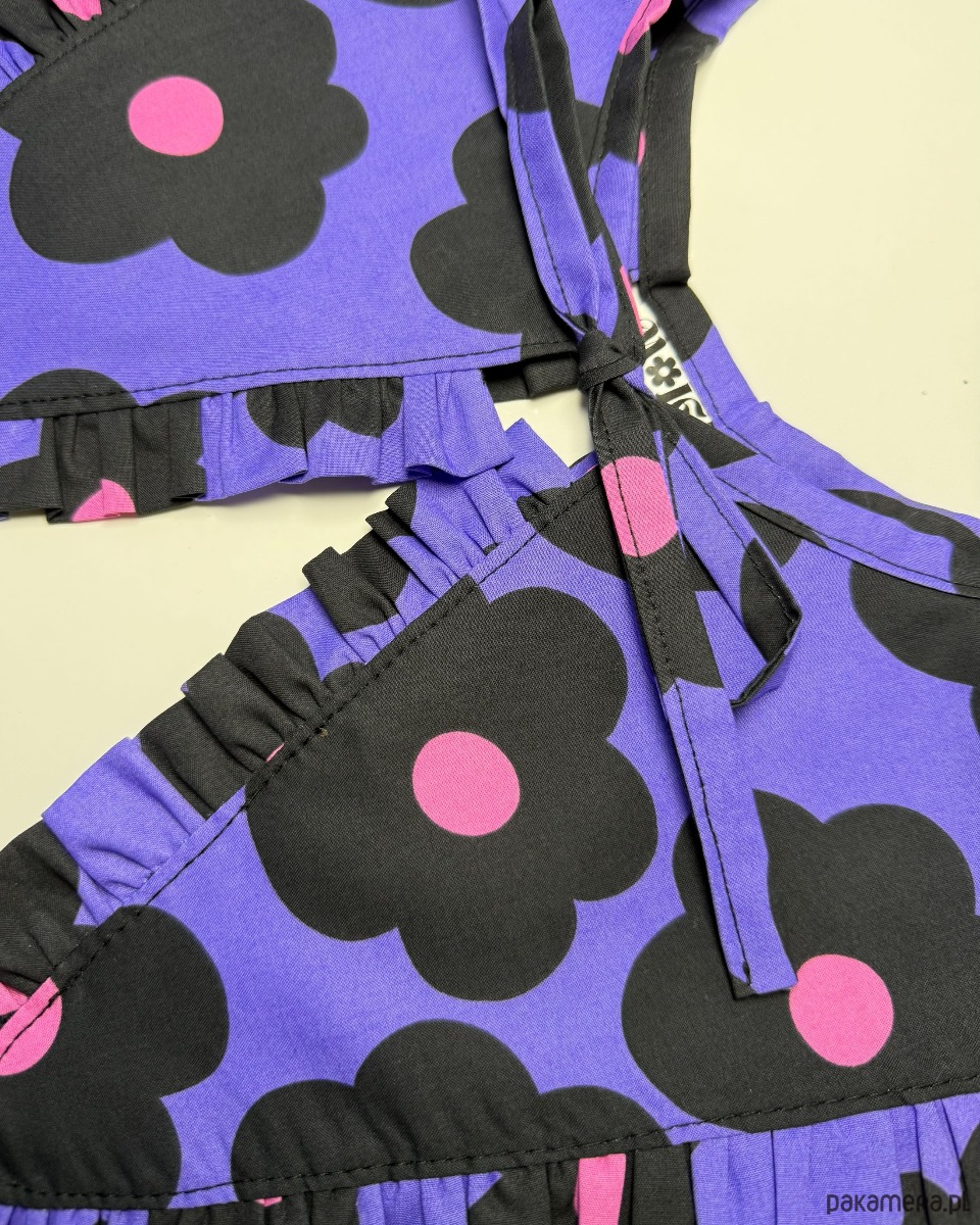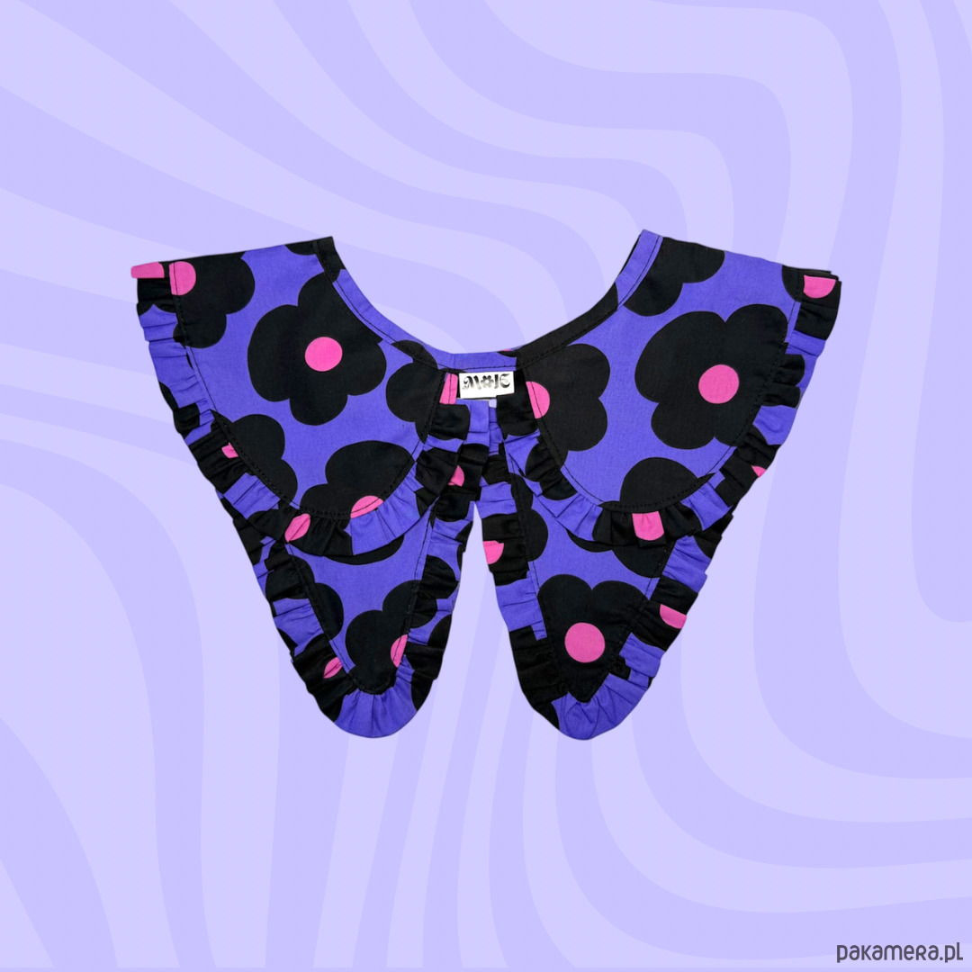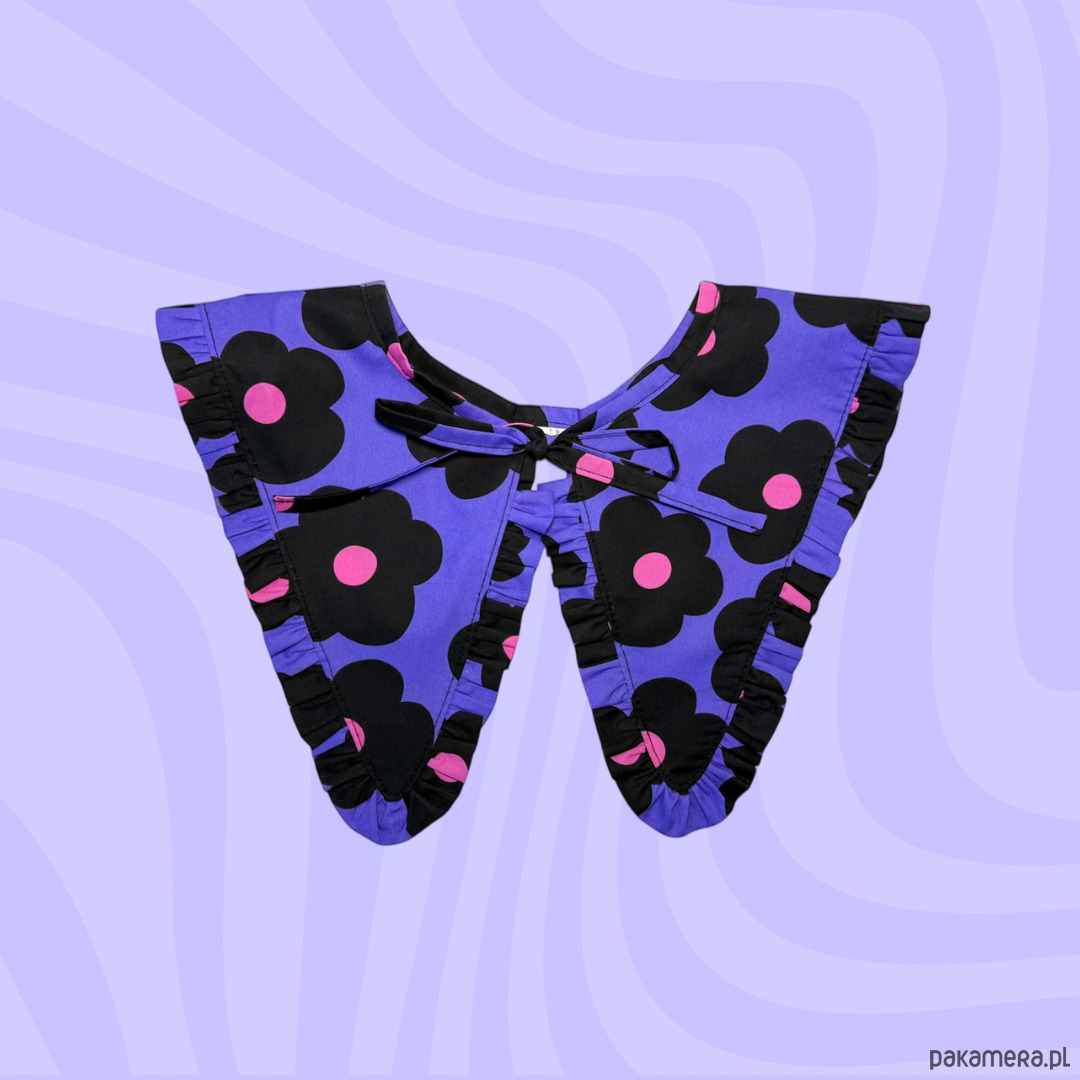 Wiązany kołnierzyk wykonany z fioletowej tkaniny bawełnianej drukowanej w czarne duże kwiaty.