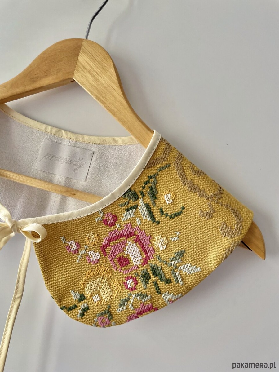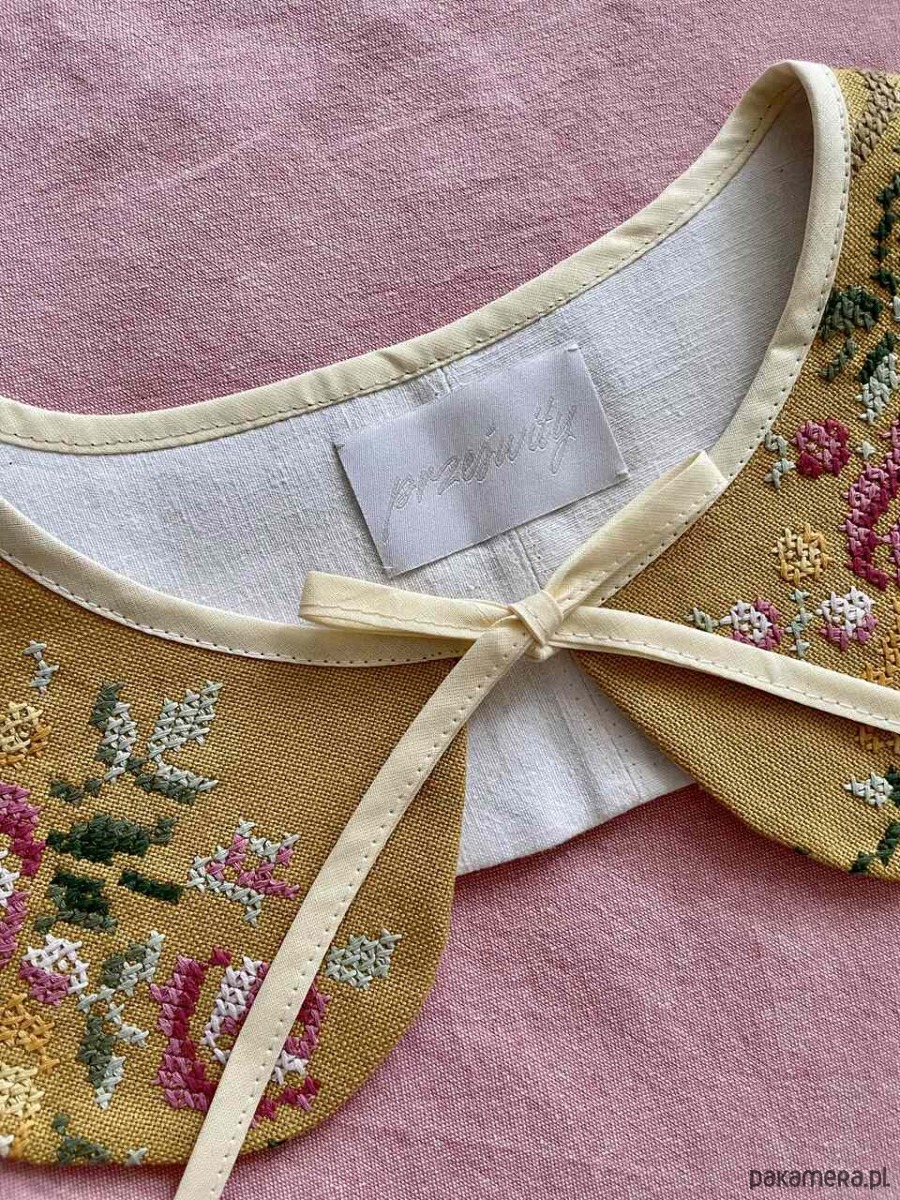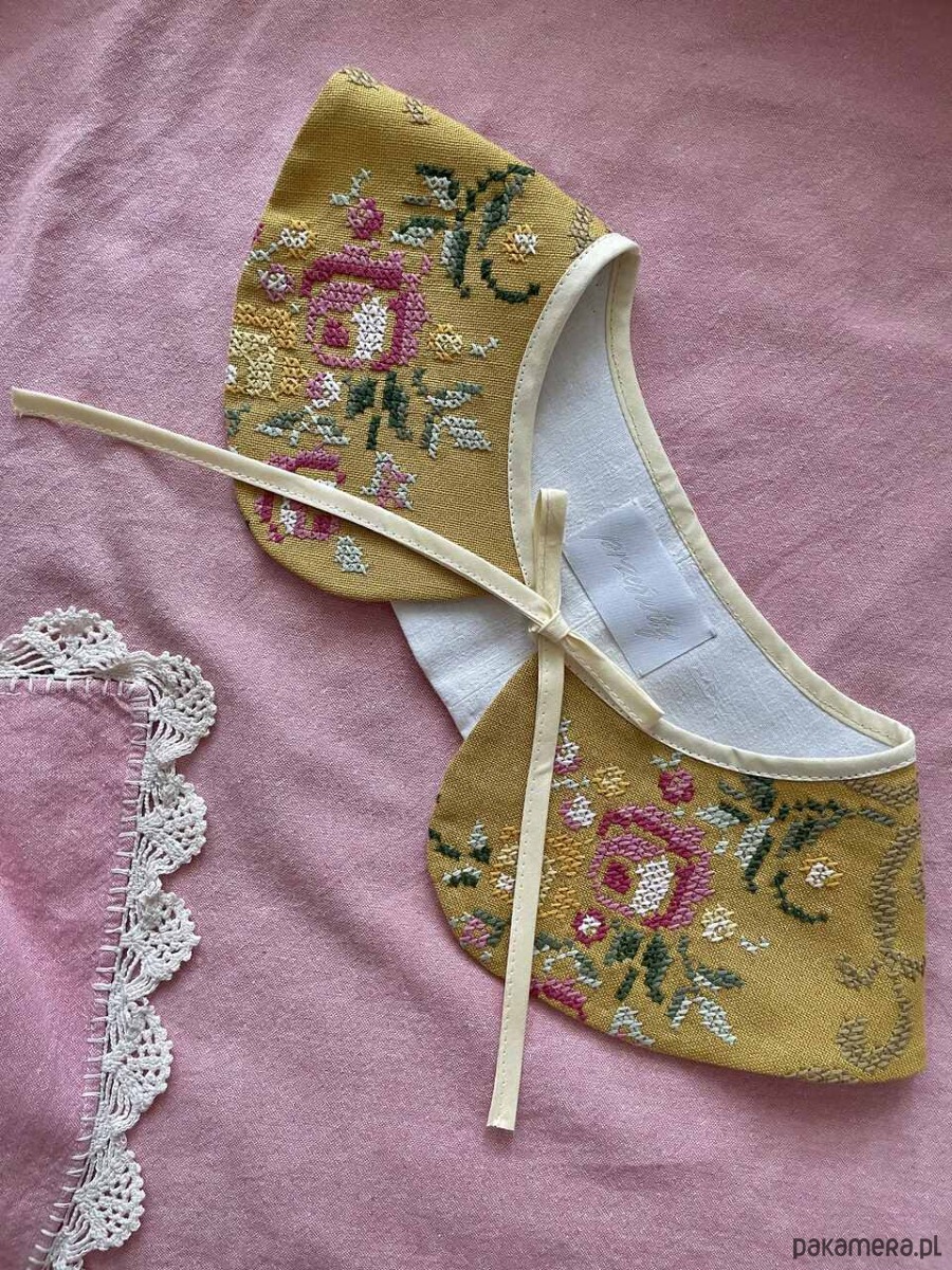 Kołnierzyk uszyty ręcznie z haftowanego bawełnianego obrusa z drugiego obiegu.