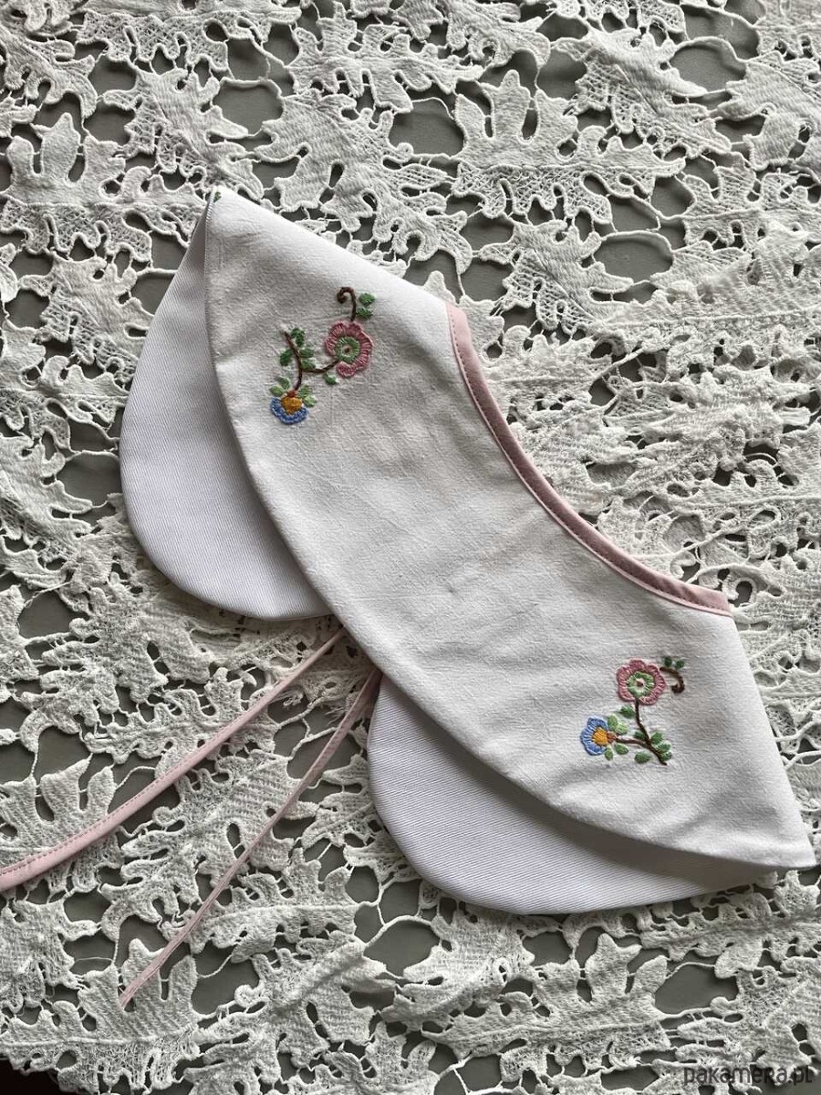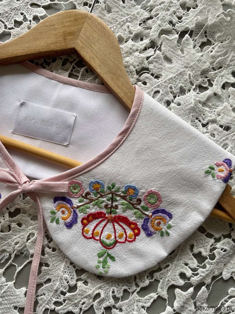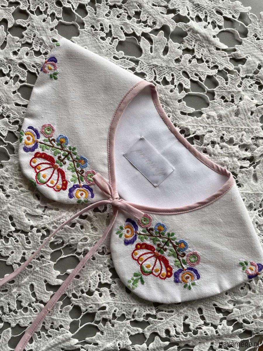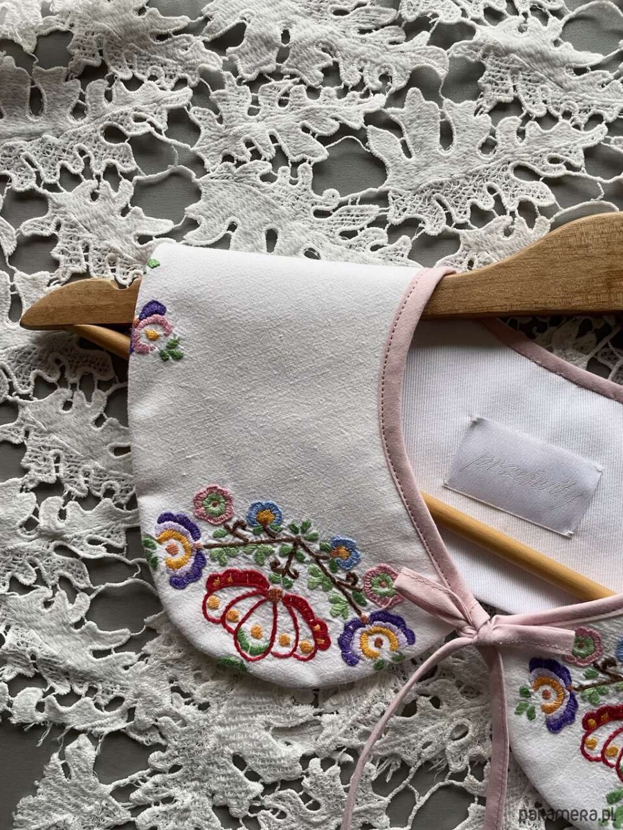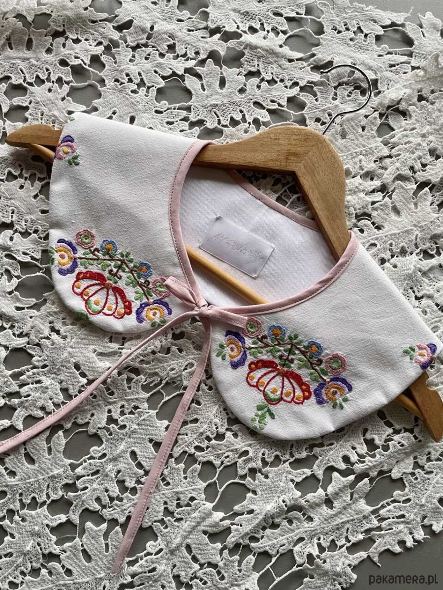 Kołnierzyk uszyty ręcznie z bawełnianego obrusa z kwiatowym haftem z drugiego obiegu.