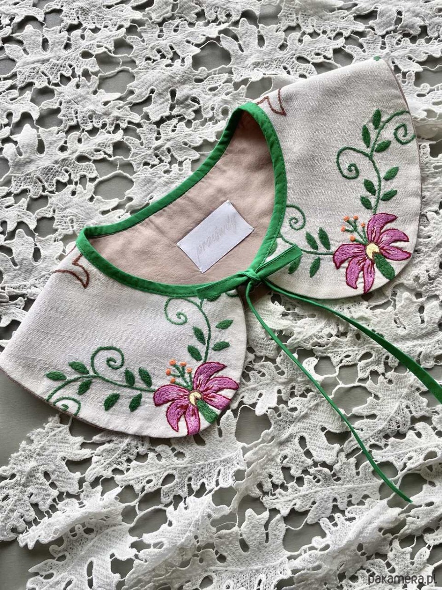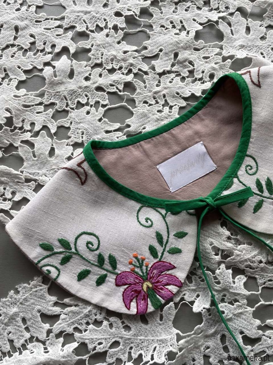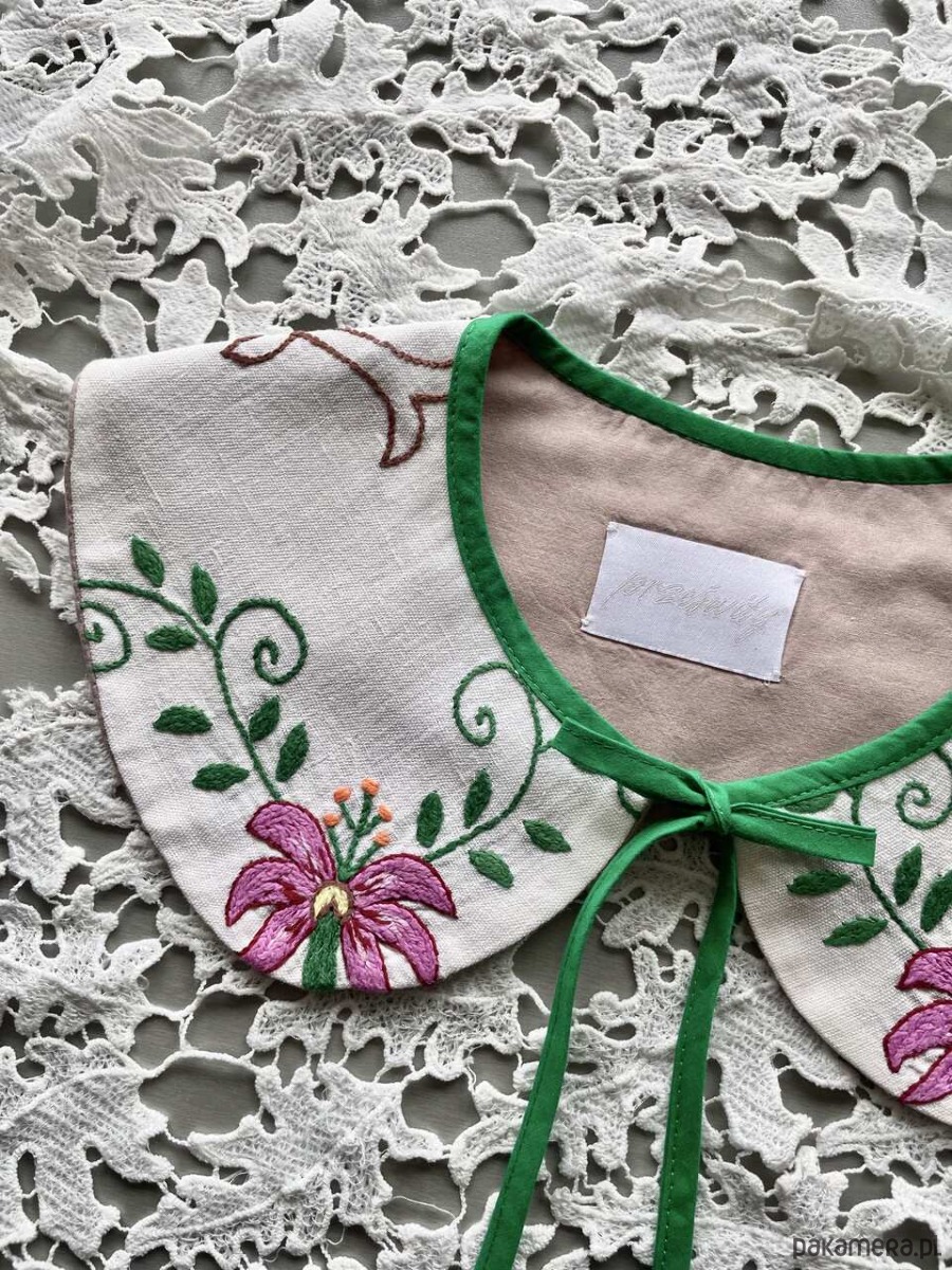 Kołnierzyk uszyty ręcznie z bawełnianego obrusa z kwiatowym haftem z drugiego obiegu.