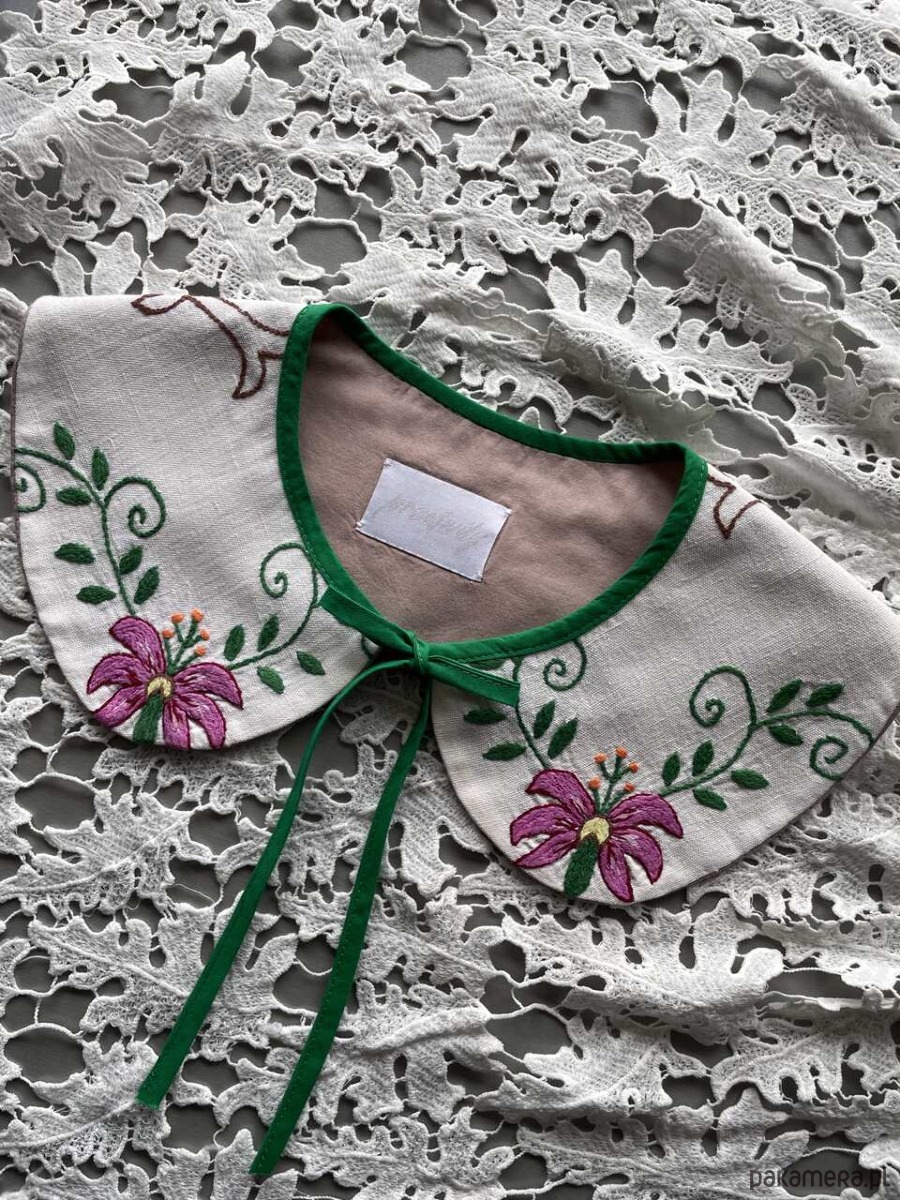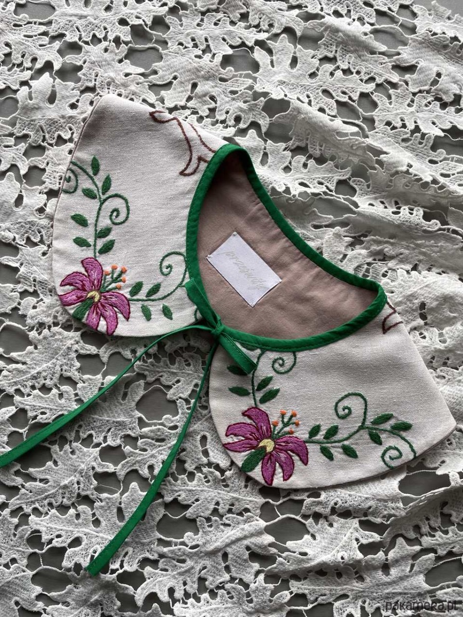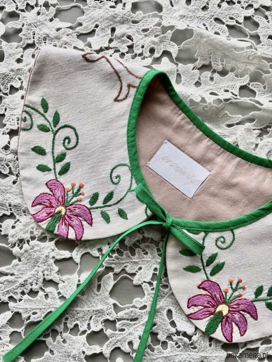 Kołnierzyk uszyty ręcznie z bawełnianego obrusa z kwiatowym haftem z drugiego obiegu.
