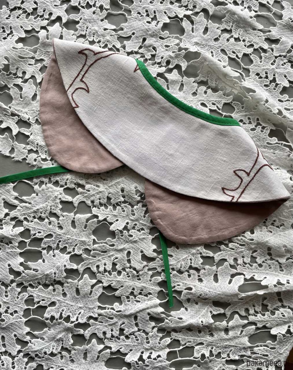 Każdy kołnierzyk powstaje z tkanin z drugiego obiegu, dlatego mogą pojawić się na nich niewielkie ślady użytkowania. Zawsze staramy się je odczarować: haftem, kompozycją, detalem. Prosimy o wyrozumiałość, to naturalna część pracy z materiałami, które już miały swoje życie.