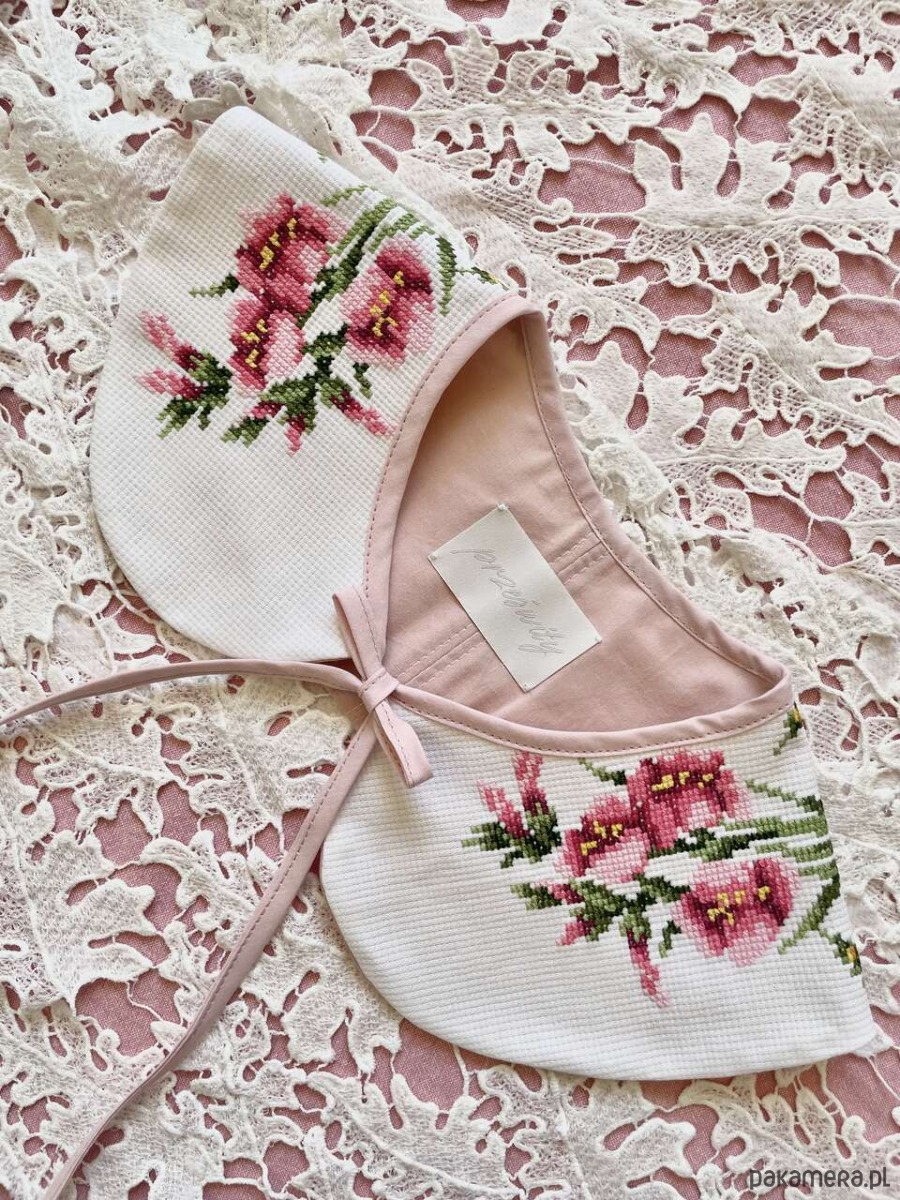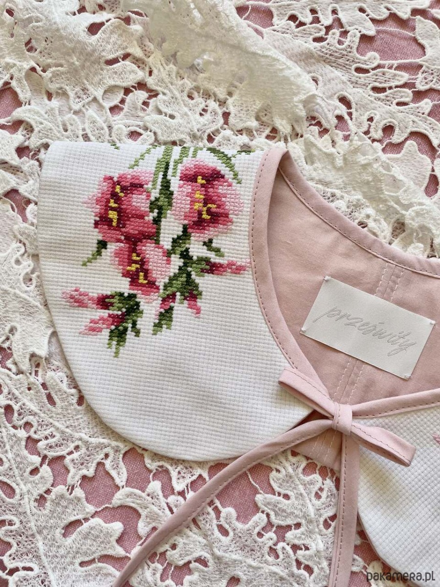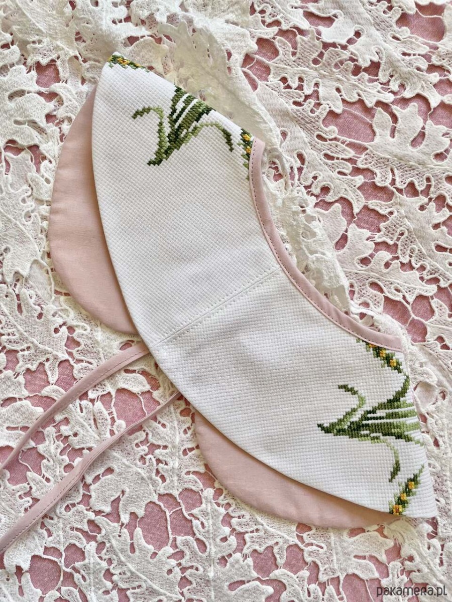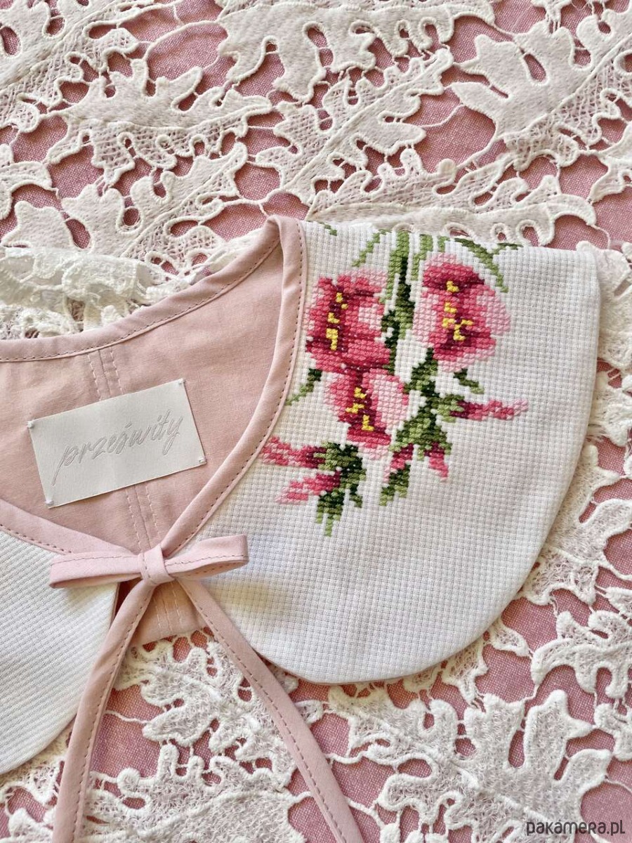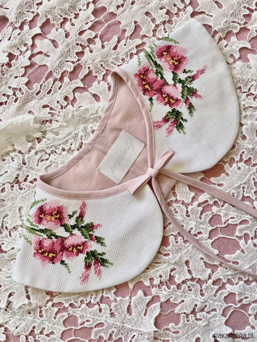 Kołnierzyk uszyty ręcznie z bawełnianego obrusa z kwiatowym haftem z drugiego obiegu.