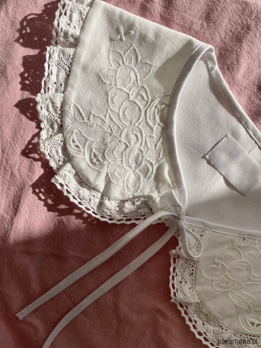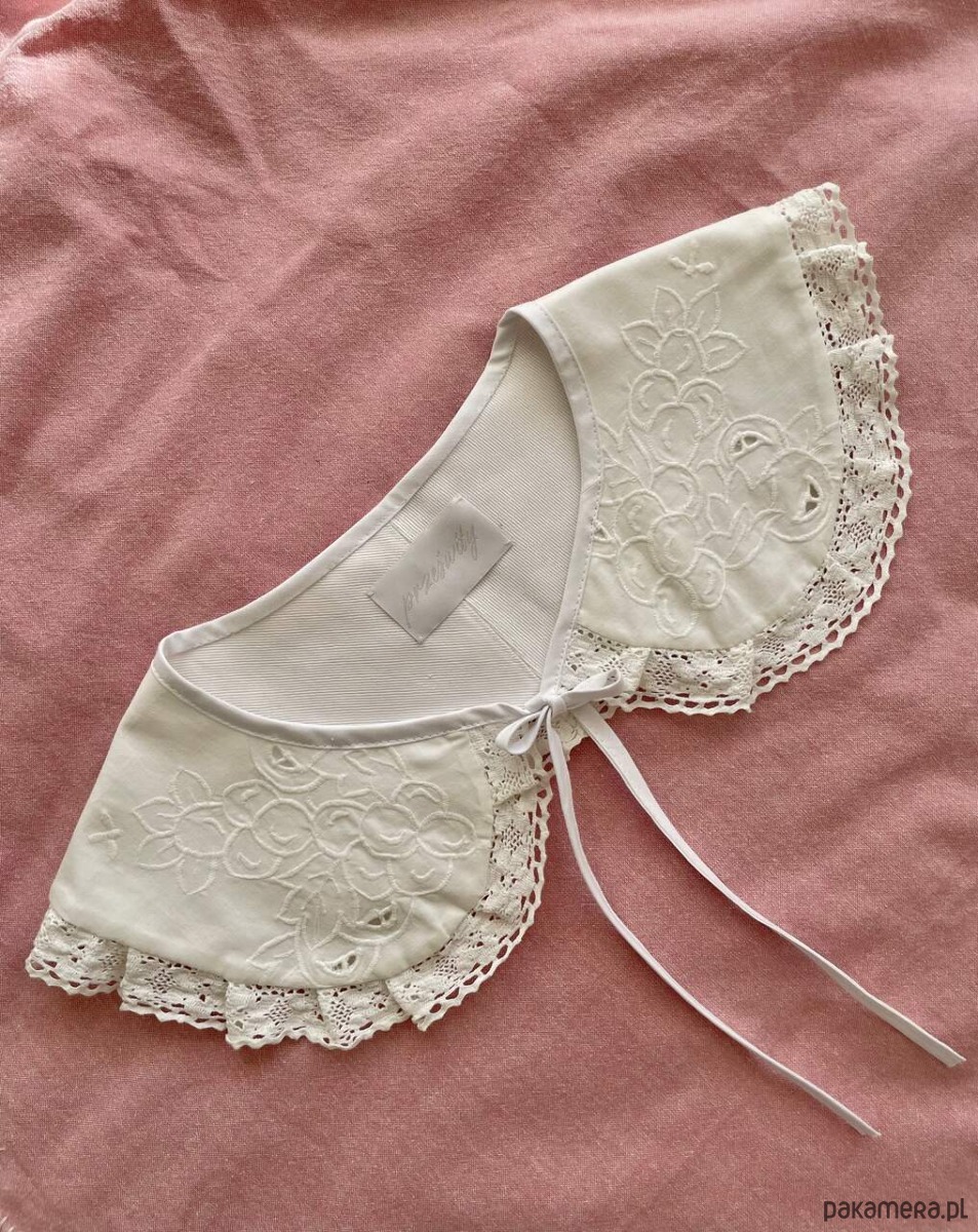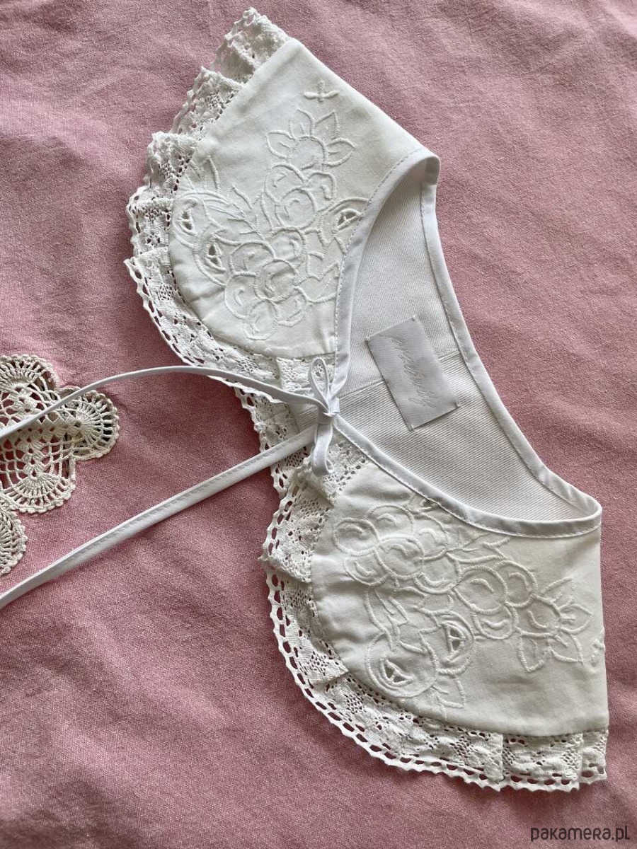 Kołnierzyk uszyty ręcznie z bawełnianego obrusa z delikatnym haftem richelieu z drugiego obiegu.
