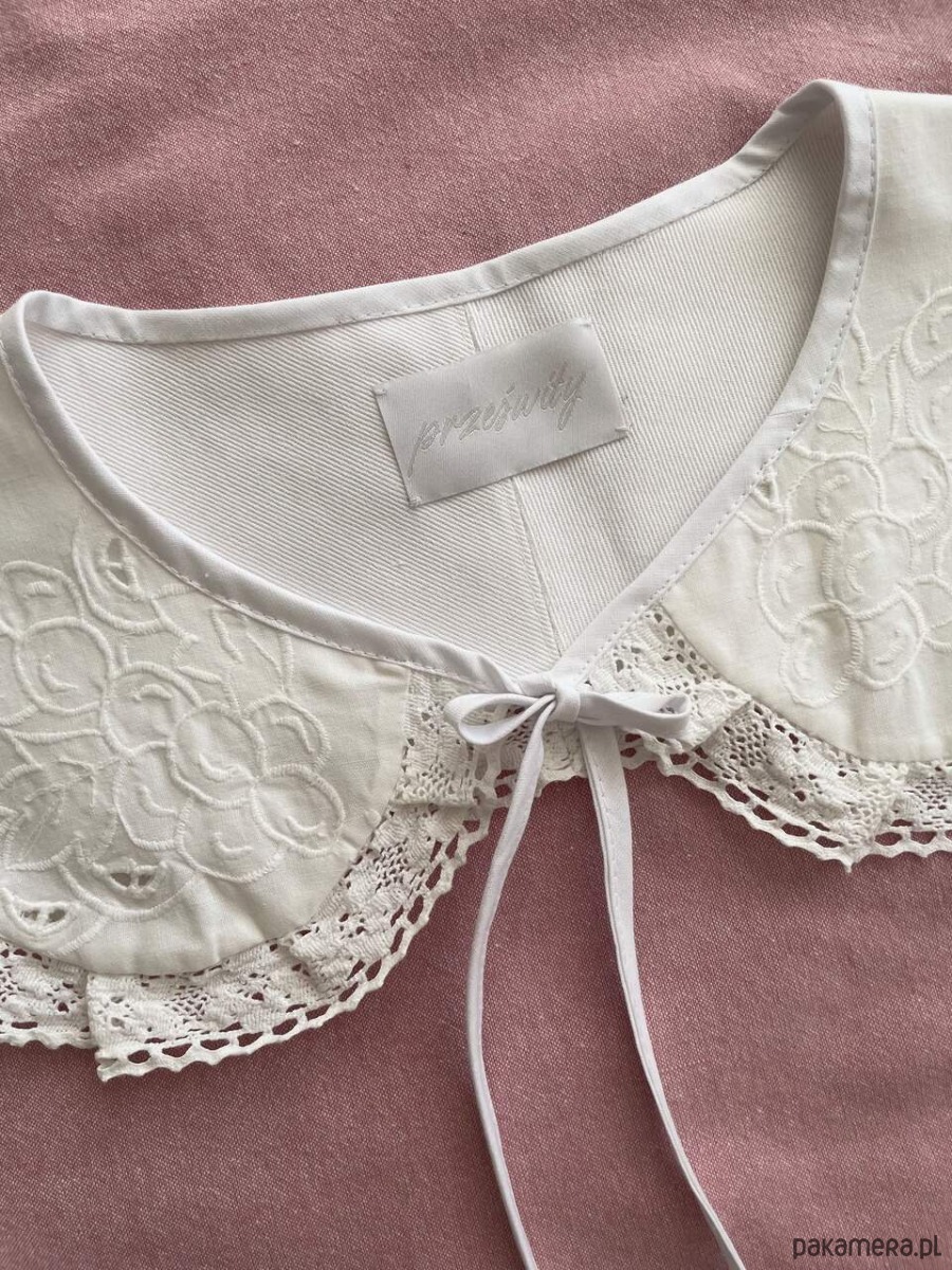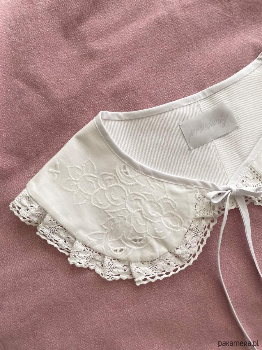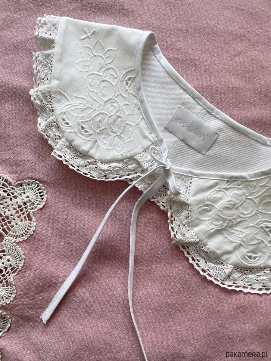 Kołnierzyk uszyty ręcznie z bawełnianego obrusa z delikatnym haftem richelieu z drugiego obiegu.