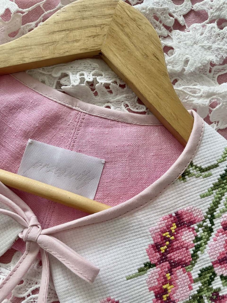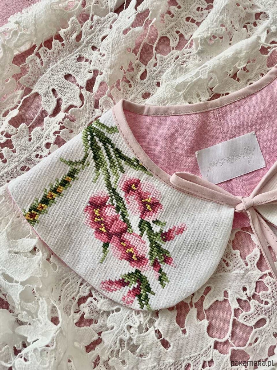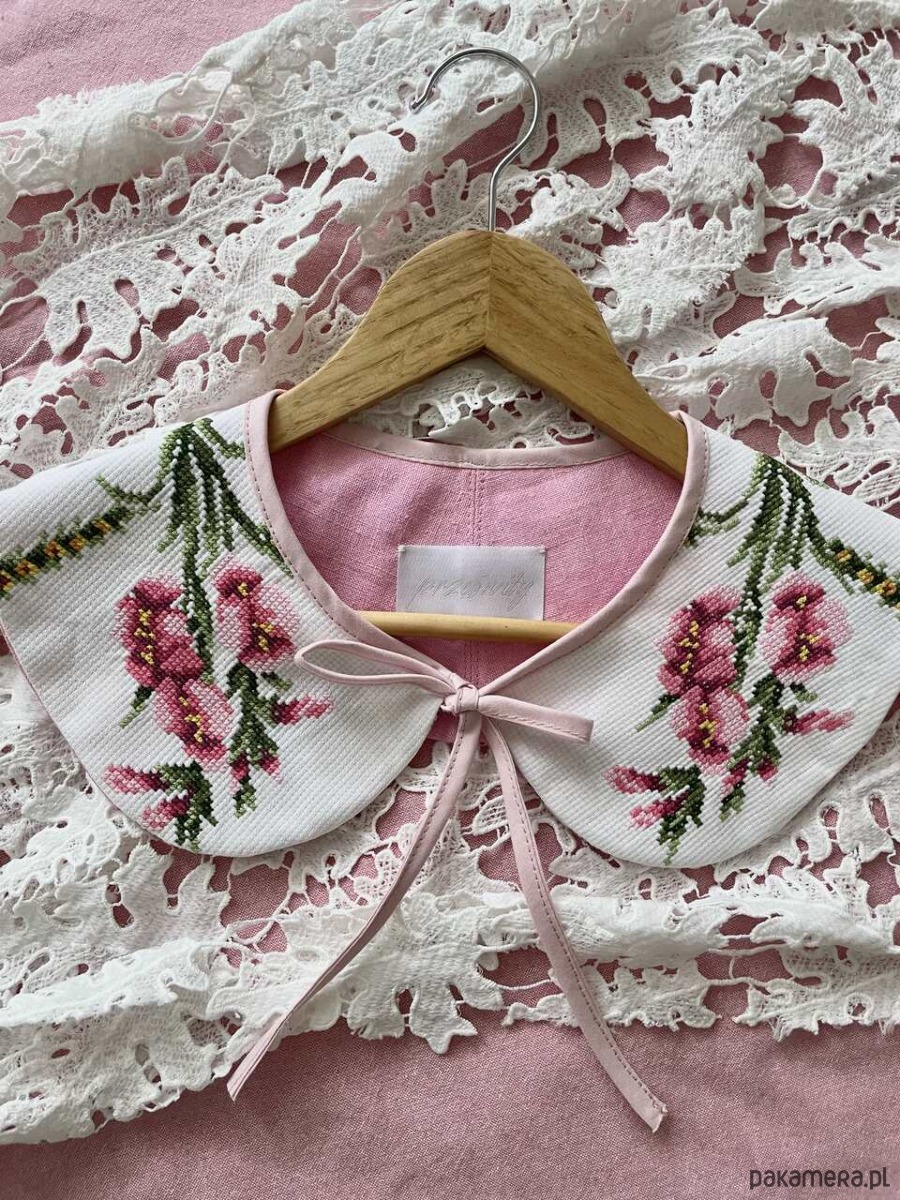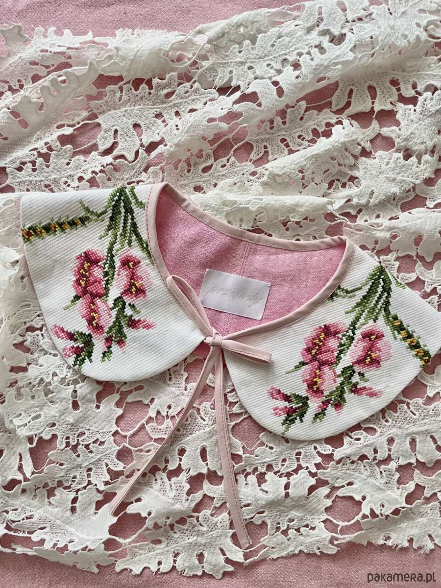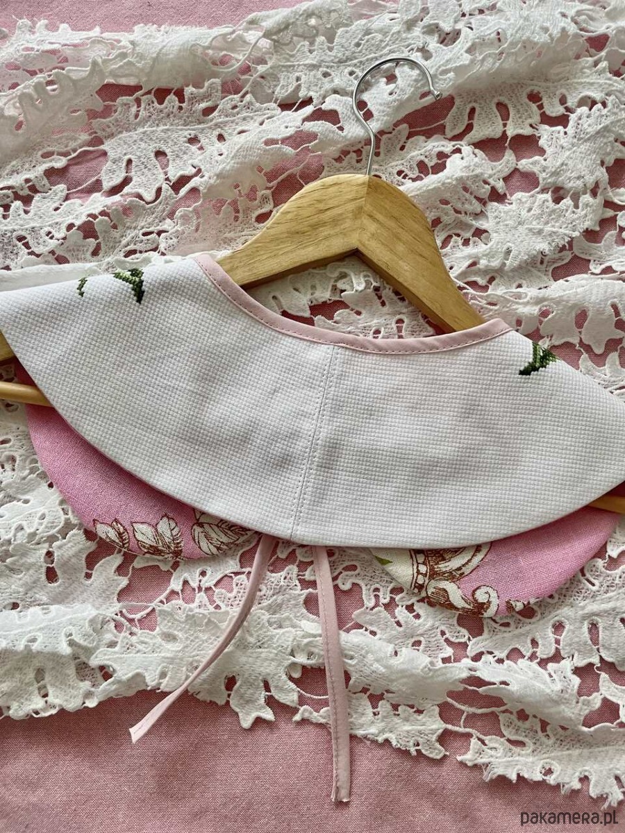Kołnierzyk uszyty ręcznie z bawełnianego obrusa z kwiatowym haftem z drugiego obiegu.