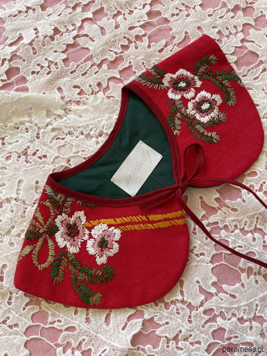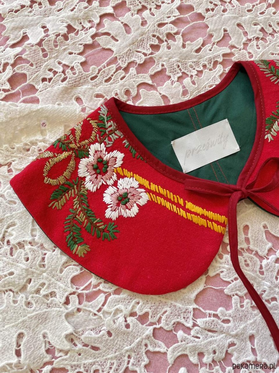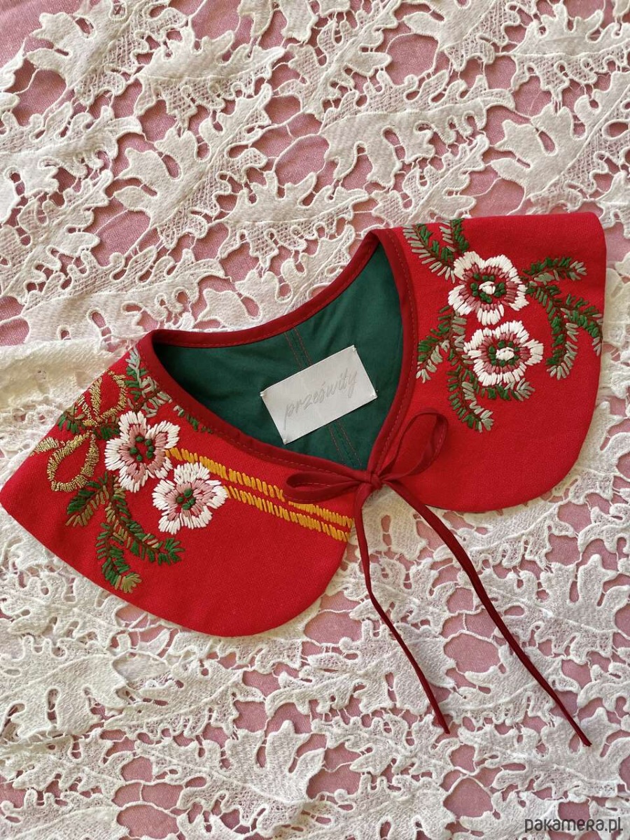 Kołnierzyk uszyty ręcznie z bawełnianego haftowanego obrusa z drugiego obiegu.