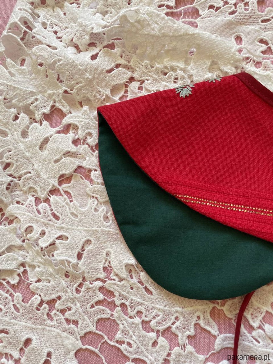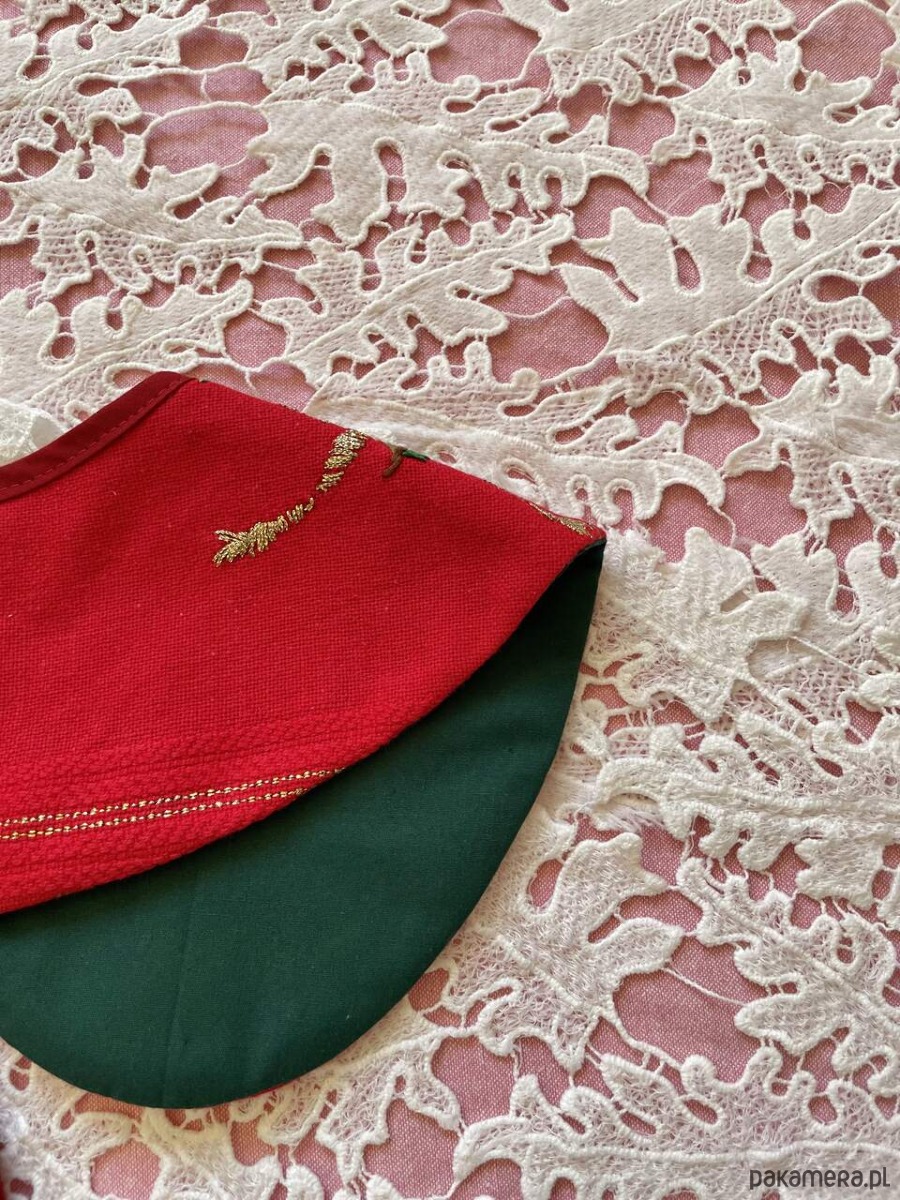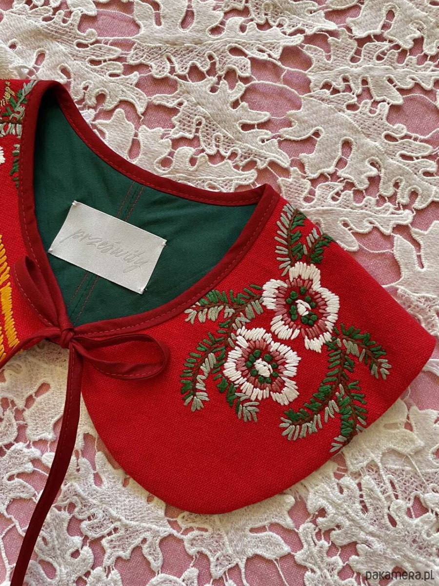Kołnierzyk uszyty ręcznie z bawełnianego haftowanego obrusa z drugiego obiegu.