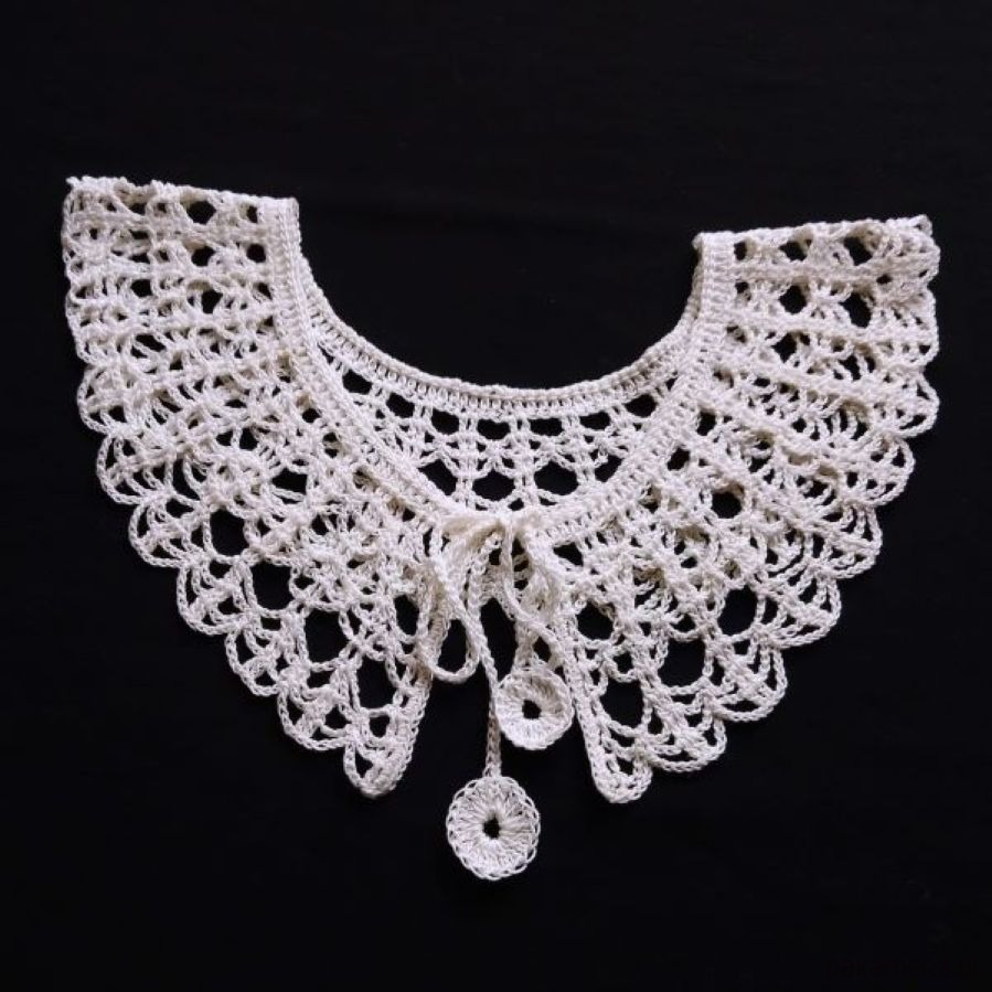 Uroczy koronkowy kołnierzyk wykonany na szydełku z kordonku w kolorze naturalnej bieli. Idealny do ozdobienia sweterka, małej czarnej. Zapinany na guziczek. Obwód 52cm. Prać ręcznie w temp. 30st.C, suszyć w stanie rozłożonym.