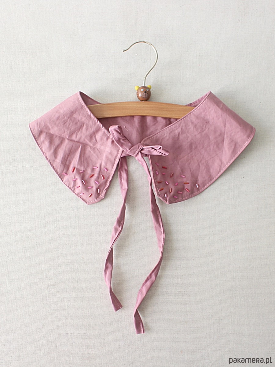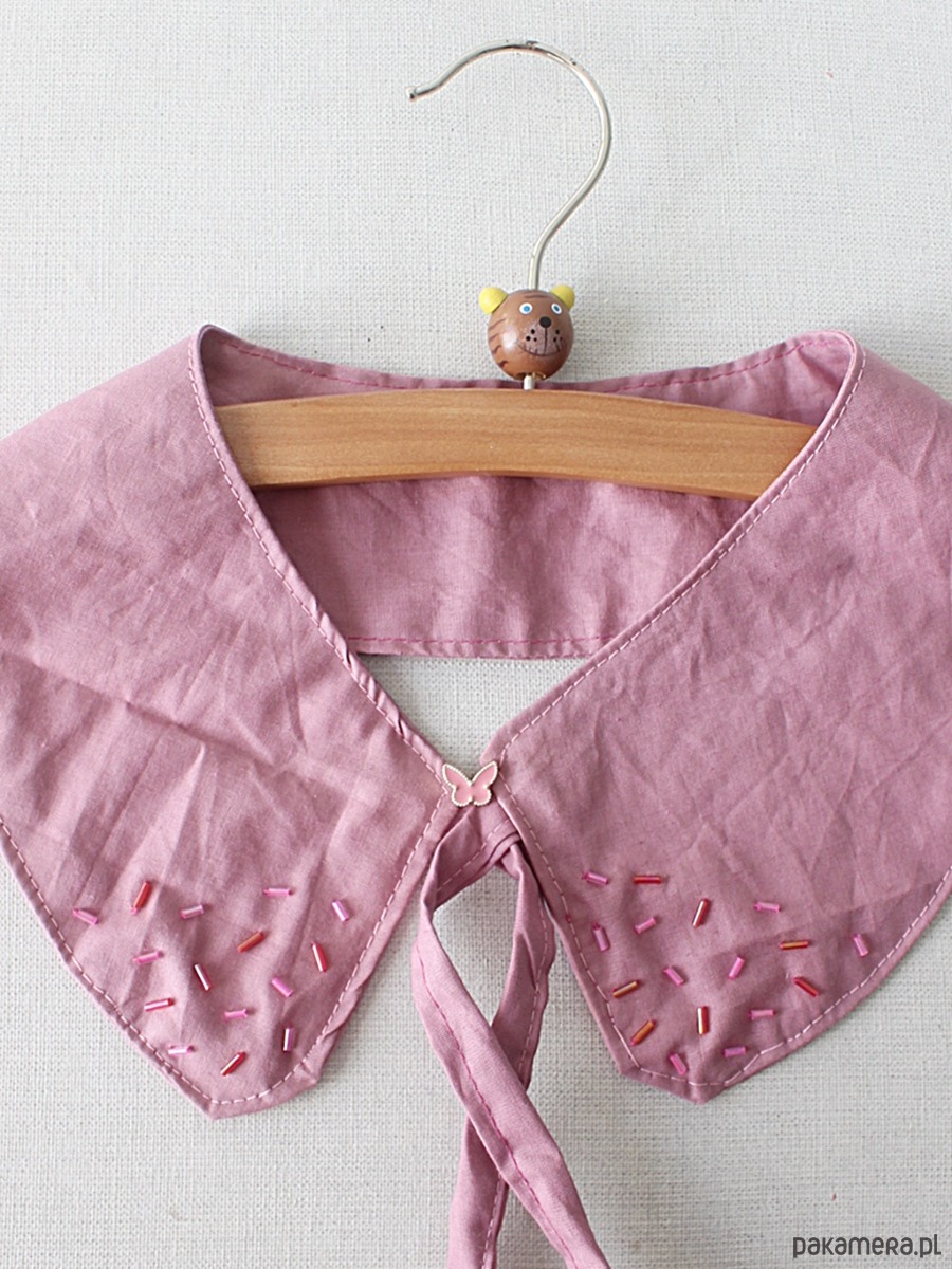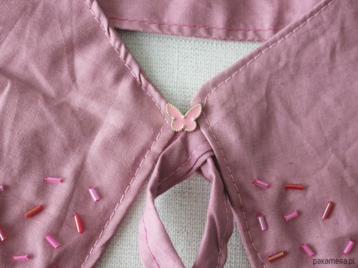 Na kołnierzyk ręcznie naszyte są koraliki w odcieniach różowego i bordowego.