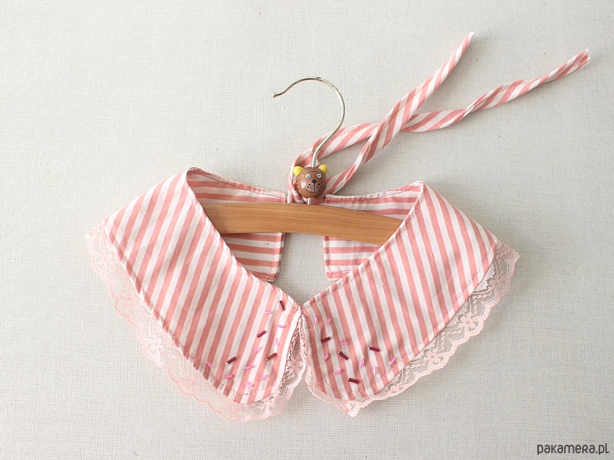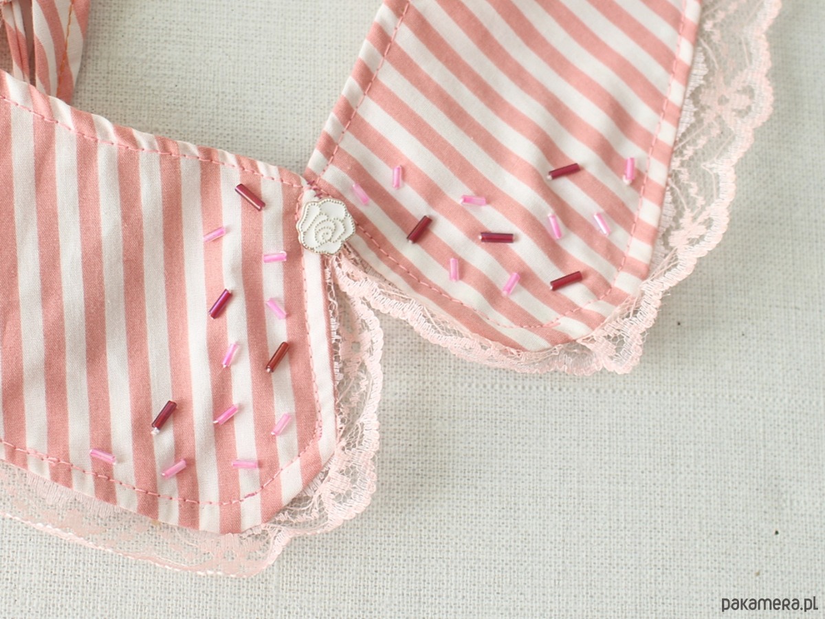 Kołnierzyk w paski, wiązany z tyłu. Dookoła jasnoróżowa koronka.