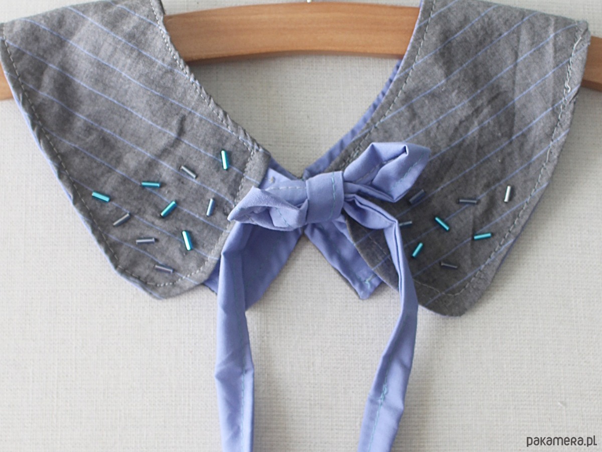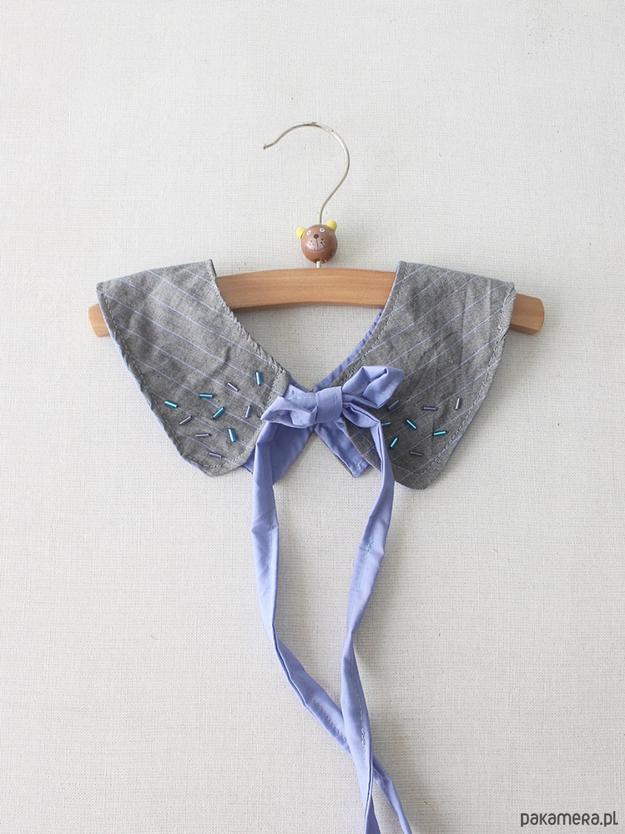Na kołnierzyk ręcznie naszyte są koraliki w odcieniach niebieskiego.