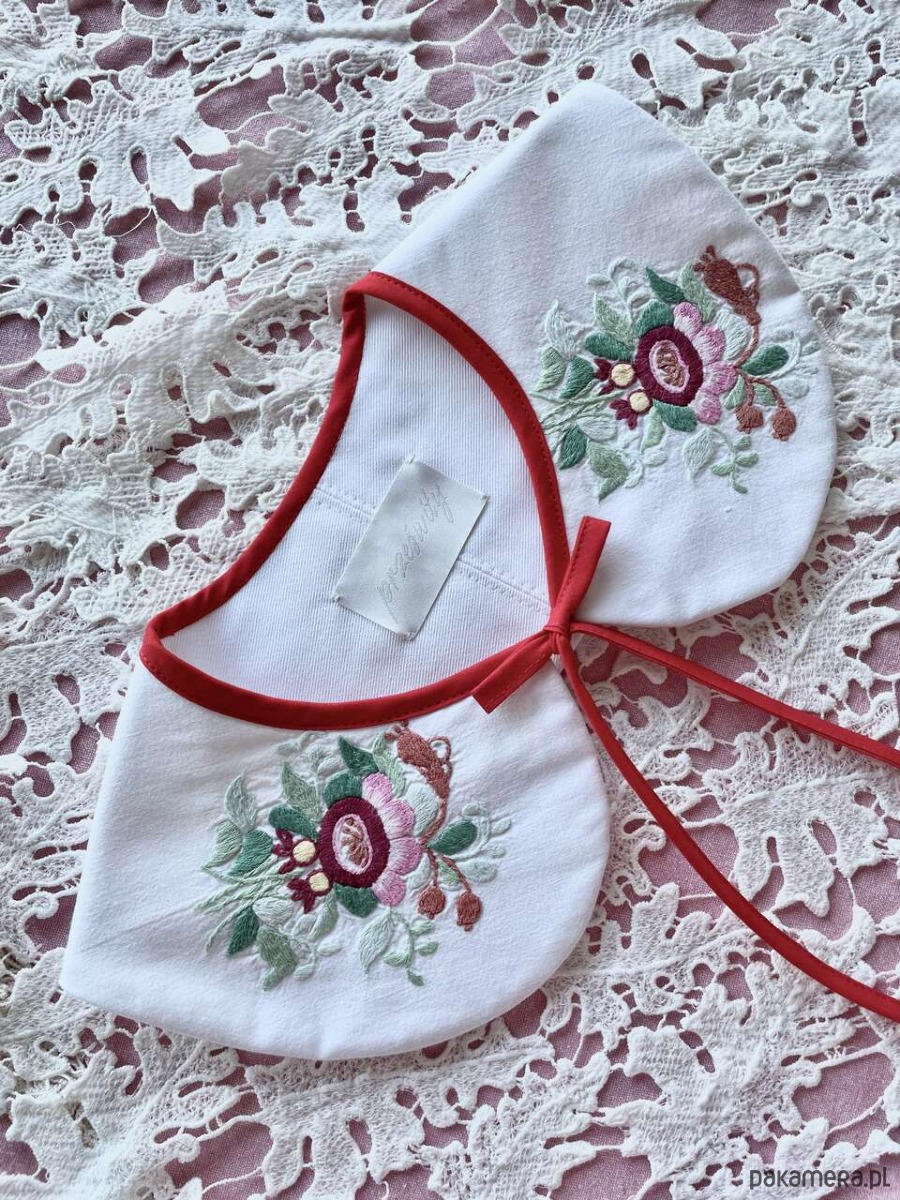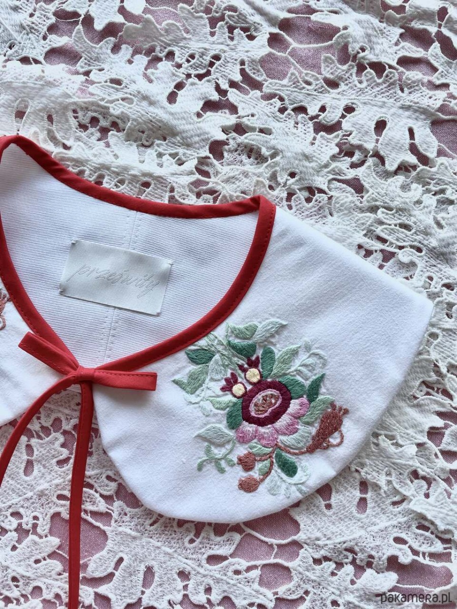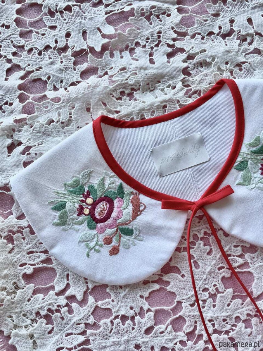 Kołnierzyk uszyty ręcznie z bawełnianego obrusa z kwiatowym haftem z drugiego obiegu.