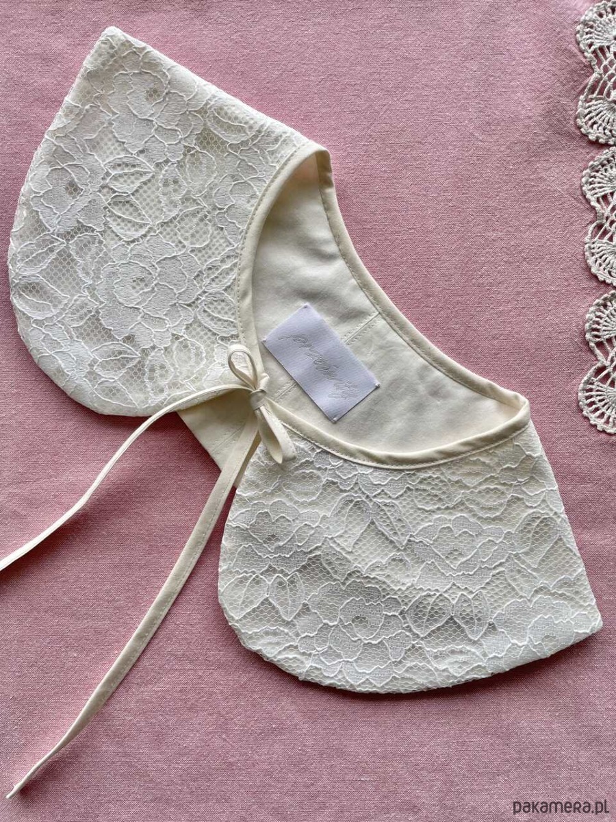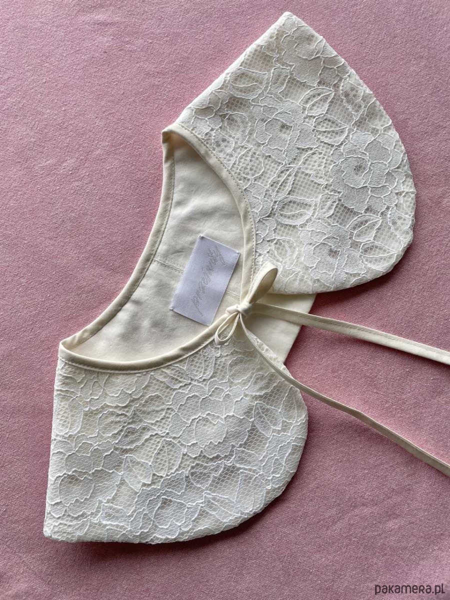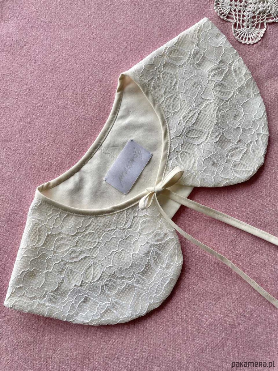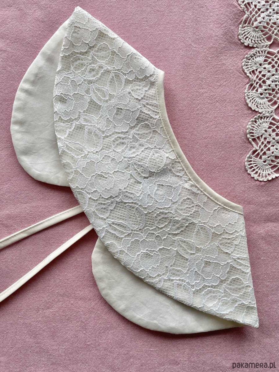 Kołnierzyk koronkowy uszyty ręcznie z firanki z drugiego obiegu z bawełnianą podszewką.