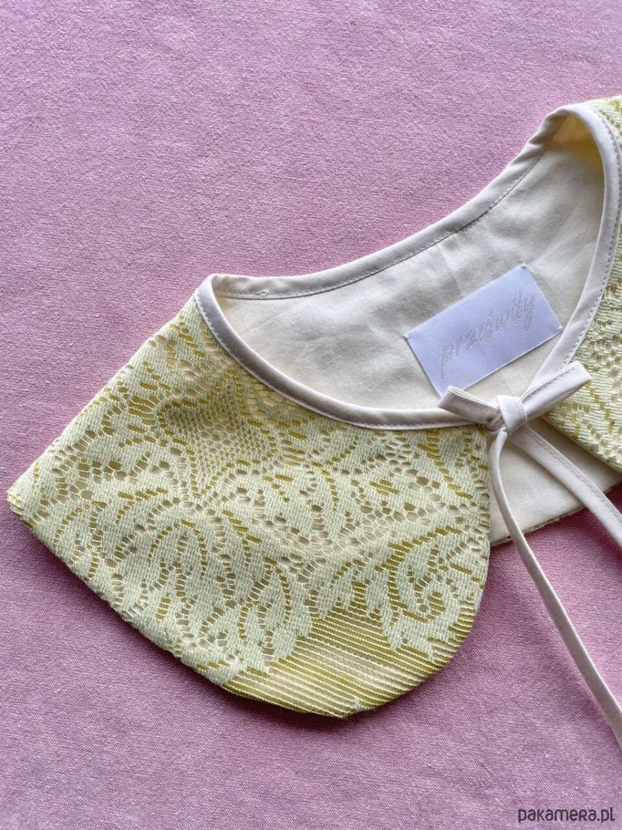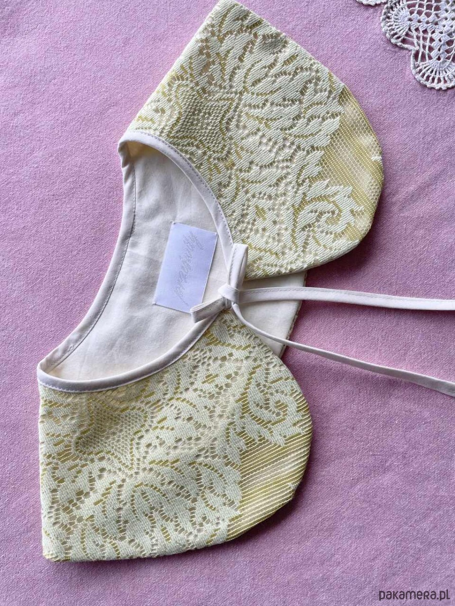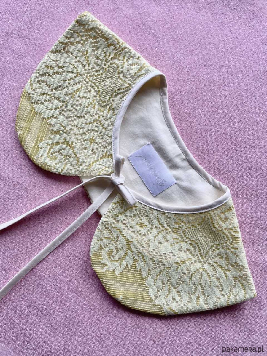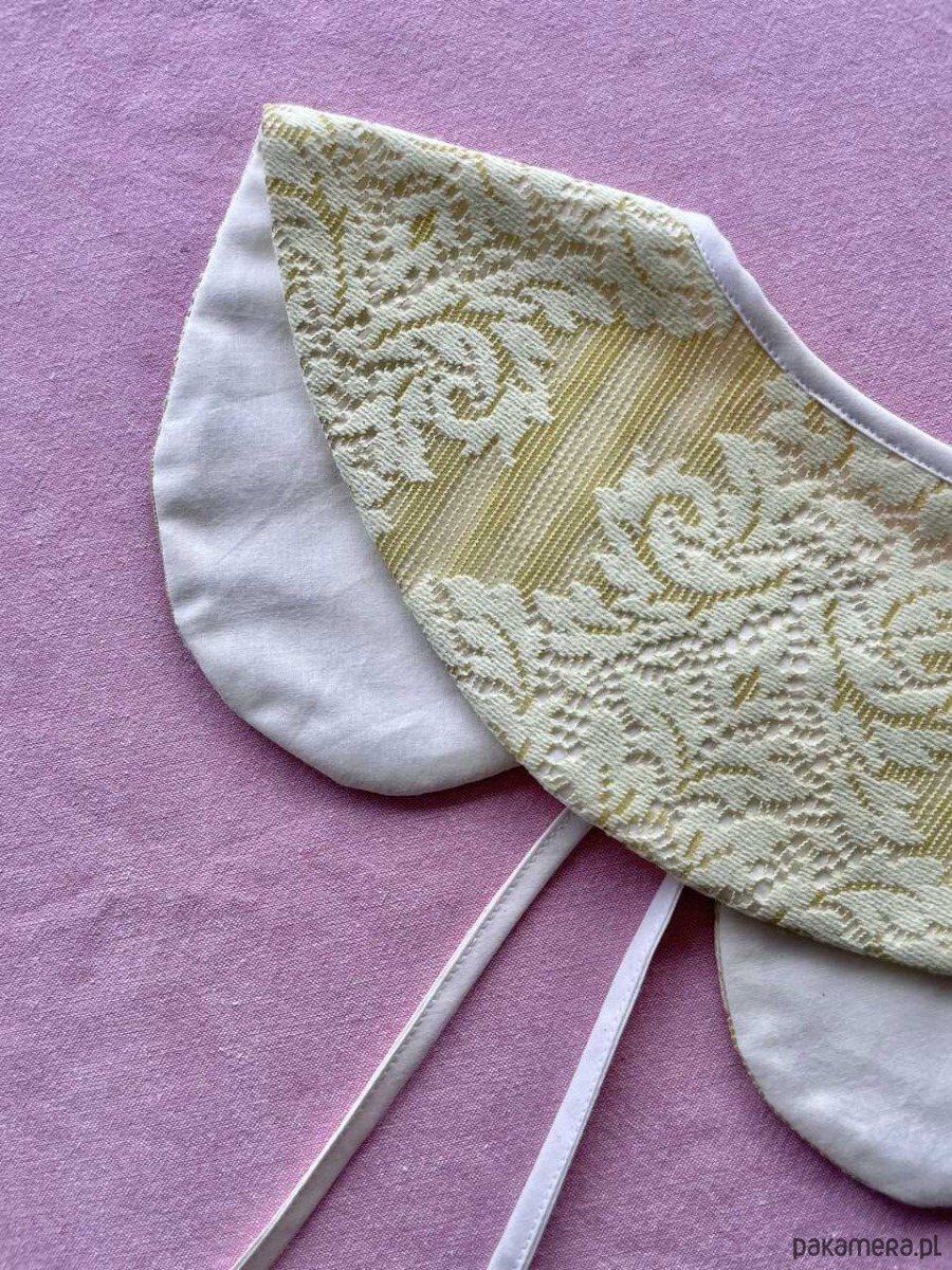 Kołnierzyk koronkowy uszyty ręcznie z firanki z drugiego obiegu z bawełnianą masełkową podszewką.