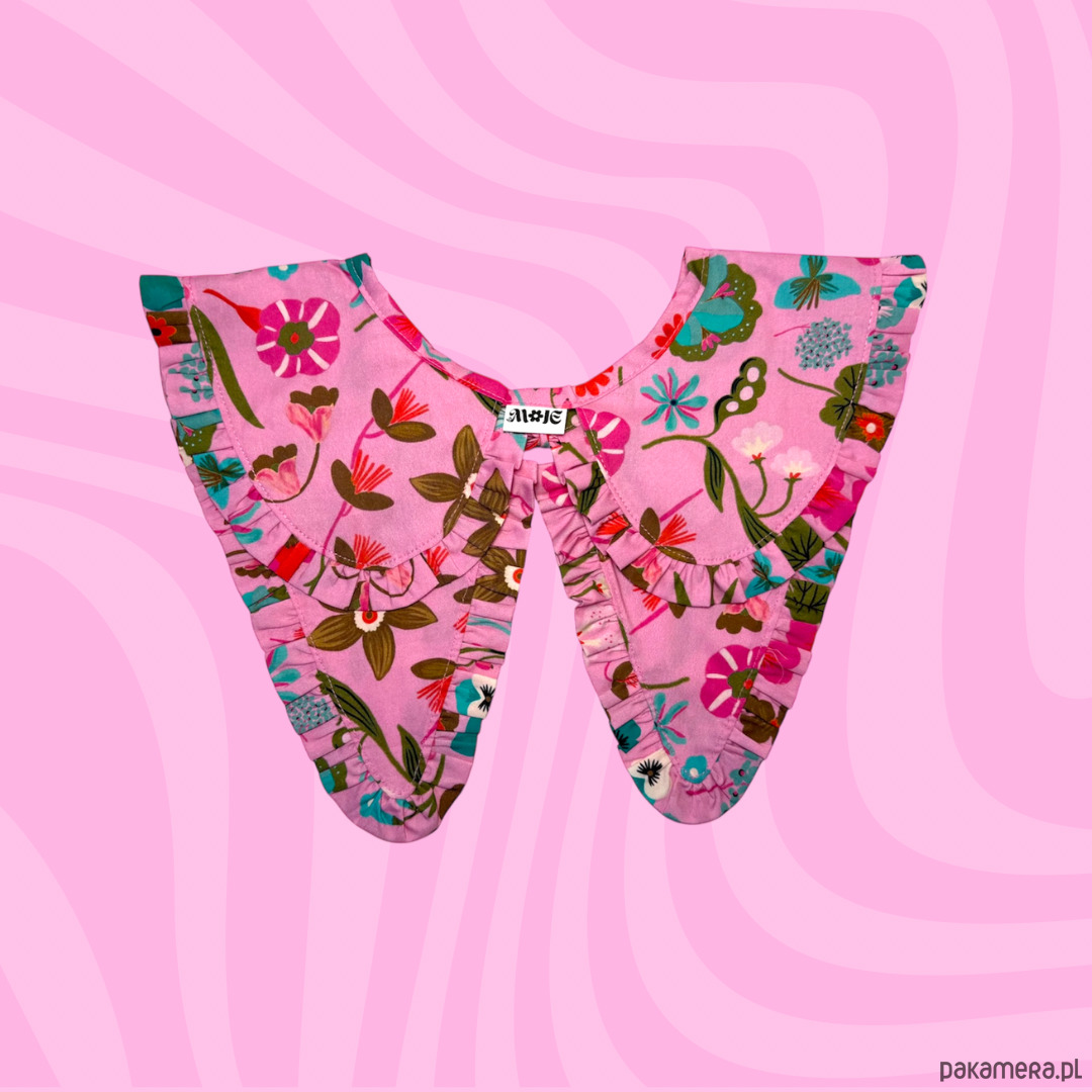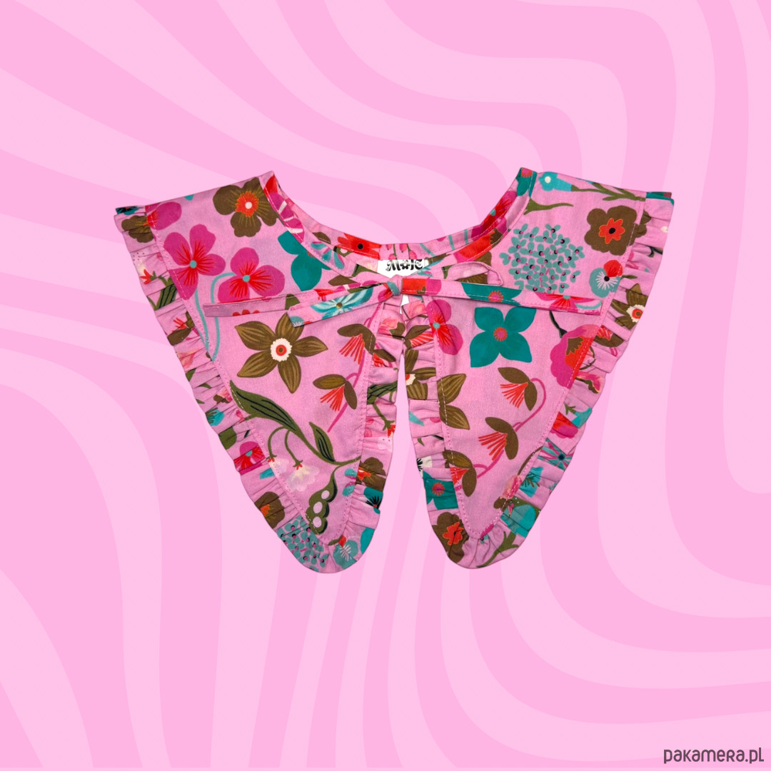 Wiązany kołnierzyk wykonany z różowej tkaniny bawełnianej w kolorowe kwiaty.